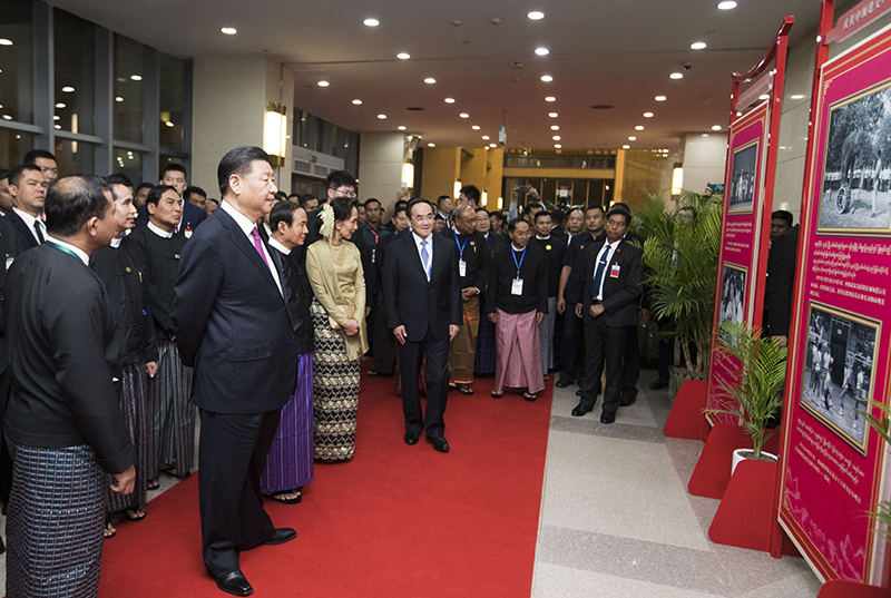 当地时间1月17日晚,国家主席习近平在内比都第二国际会议中心出席中缅建交70周年庆祝活动暨中缅文化旅游年启动仪式。这是仪式开始前,习近平在缅方领导人陪同下,观看庆祝中缅建交70周年图片展。新华社记者 黄敬文 摄
