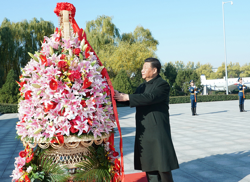11月8日,中共中央总书记、国家主席、中央军委主席习近平出席庆祝空军成立70周年主题活动,代表党中央和中央军委,对空军成立70周年表示热烈祝贺,向空军全体官兵致以诚挚问候。这是习近平来到位于北京市昌平区的中国航空博物馆,向人民空军英烈敬献花篮。新华社记者 李刚 摄