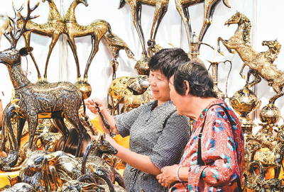 9月23日,在广西南宁举行的第十六届中国—东盟博览会上,“一带一路”相关国家的参展商带来的商品吸引众多参观者前来选购。图为参观者在南宁国际会展中心选购巴基斯坦青铜器。新华社记者 曹祎铭 摄