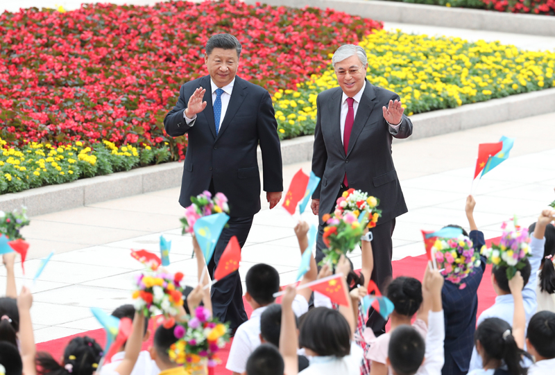 9月11日,国家主席习近平在北京人民大会堂同哈萨克斯坦总统托卡耶夫举行会谈。这是会谈前,习近平在人民大会堂东门外广场为托卡耶夫举行欢迎仪式。新华社记者 丁林 摄