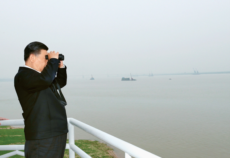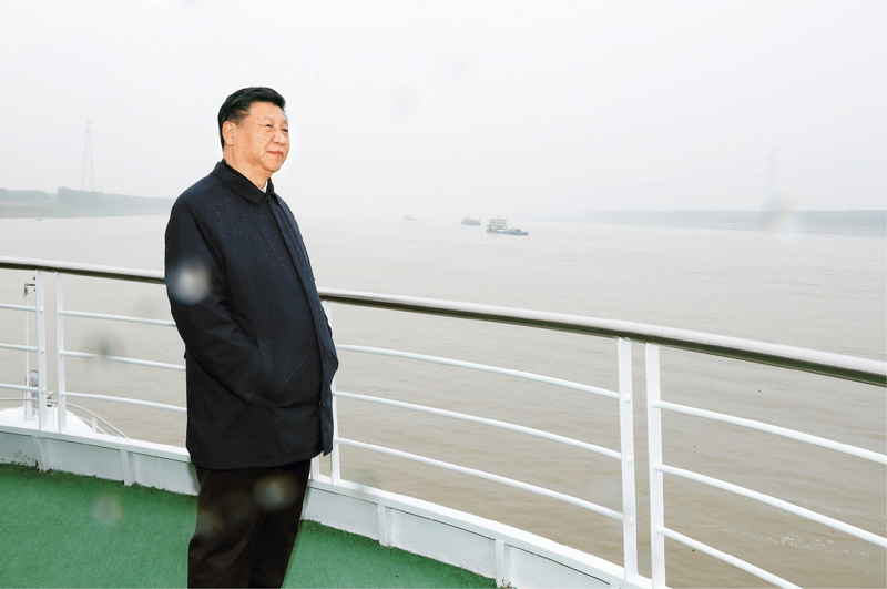 2018年4月26日下午,中共中央总书记、国家主席、中央军委主席习近平在武汉主持召开深入推动长江经济带发展座谈会并发表重要讲话。这是座谈会前,习近平于25日上午乘船沿江察看两岸生态环境和发展建设情况。新华社记者 谢环驰/摄