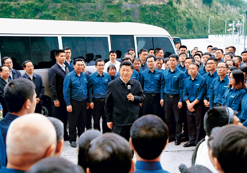 2018年4月26日下午,中共中央总书记、国家主席、中央军委主席习近平在武汉主持召开深入推动长江经济带发展座谈会并发表重要讲话。这是座谈会前,习近平于24日下午在三峡大坝左岸电站考察。新华社记者 谢环驰/摄