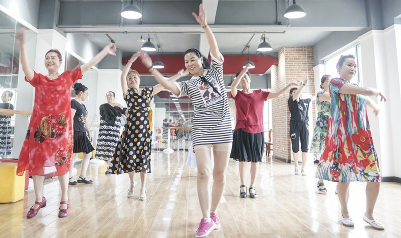 居民们在湖北省武汉市青山区棚改安置小区青和居社区活动中心练舞(7月30日摄)。新华社记者 程敏 摄