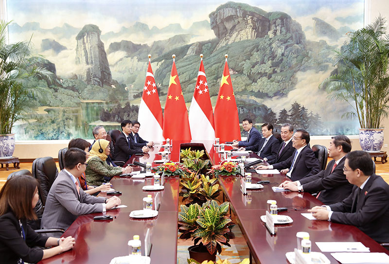 李克强表示,中国和新加坡隔海相望,两国在相互尊重、平等合作、互利共赢基础上发展了良好关系,给两国人民带来福祉。新加坡是个多元文明构成的社会。昨天,习近平主席同总统女士举行了富有成果的会见,展望了两国关系广阔前景。中方愿同新方发挥各自优势,保持良好合作势头,继续挖掘合作潜力,将“一带一路”倡议同新方发展战略相衔接,推动中国西部地区和新加坡对接,扎实推进“陆海新通道”、第三方市场、智慧城市、技能培训等领域合作。希望双方推进文明和文化的交流,密切人员往来,夯实两国友好的民意基础,促进双边关系继续向前发展。中方愿同新方共同应对全球性挑战,为世界和地区的和平稳定发展作出贡献。