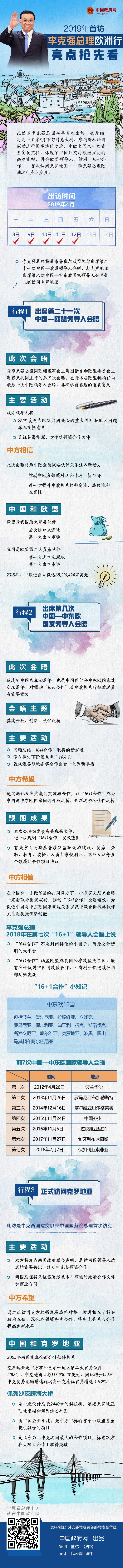 李克强总理4月8日上午乘专机离京,赴比利时首都布鲁塞尔欧盟总部出席第二十一次中国-欧盟领导人会晤、赴克罗地亚出席第八次中国-中东欧国家领导人会晤并正式访问克罗地亚。这是李克强今年首次出访。中国-欧盟领导人会晤是中欧双方进行战略沟通的高层平台,为深化中欧关系、推动对话合作发挥了重要战略引领作用。此次会晤是李克强总理同欧洲理事会主席图斯克和欧盟委员会主席容克共同主持的第五次会晤,也是本届欧盟机构任内最后一次中欧领导人会晤,具有承前启后的重要意义。此访还将推动“16+1合作”提质增效,为促进中国与中东欧国家双边关系以及中欧全面战略伙伴关系发展提供新动能。中克两国建交以来中国国务院总理首次访问克罗地亚,此访对巩固中克传统友谊、推动两国全面合作伙伴关系发展、助力中欧关系发展具有重要意义。