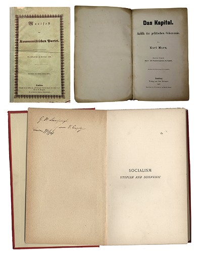 左上图为1848年《共产党宣言》德文第一版。右上图为1867年《资本论》德文第1卷第一版。下图为恩格斯的题字赠书《社会主义从空想到科学的发展》,1892年英文版。中央党史和文献研究院供图