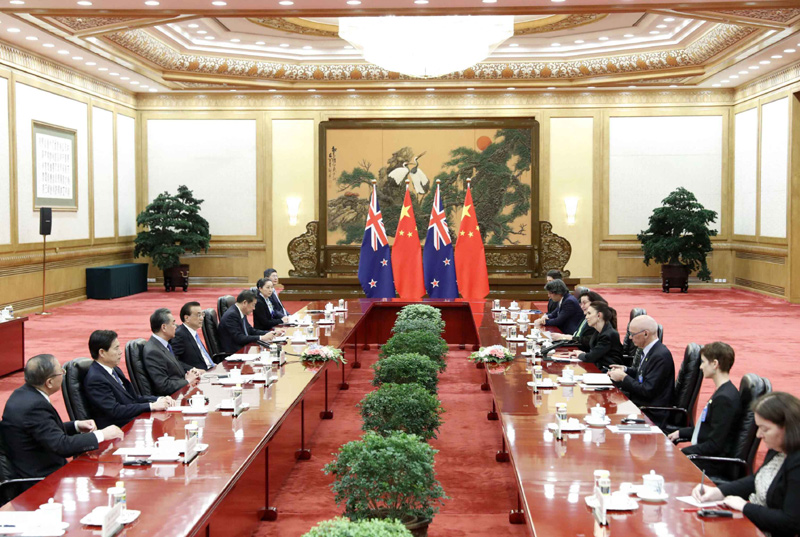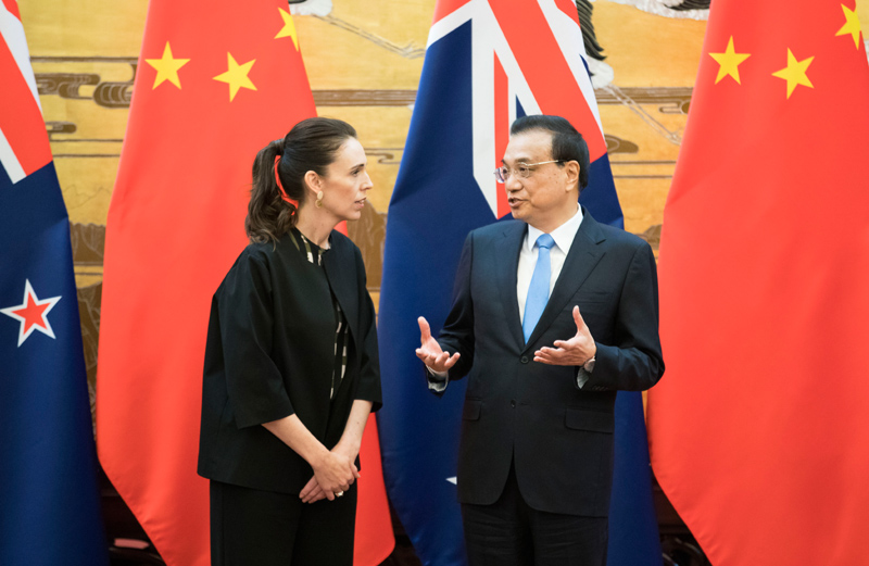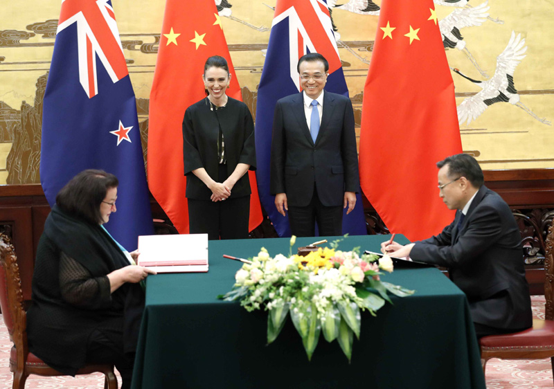 新西兰是第一个同中国签署自由贸易协定的发达国家。2016年,两国启动自贸协定升级谈判。阿德恩在会谈中表示,两国签署自贸协定以来双边贸易额增长了两倍以上,希望继续推进自贸协定升级谈判。