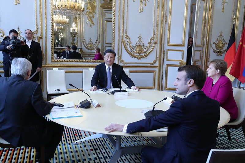 3月26日,国家主席习近平在巴黎同出席中法全球治理论坛闭幕式的法国总统马克龙、德国总理默克尔和欧盟委员会主席容克举行会晤。新华社记者 高洁 摄