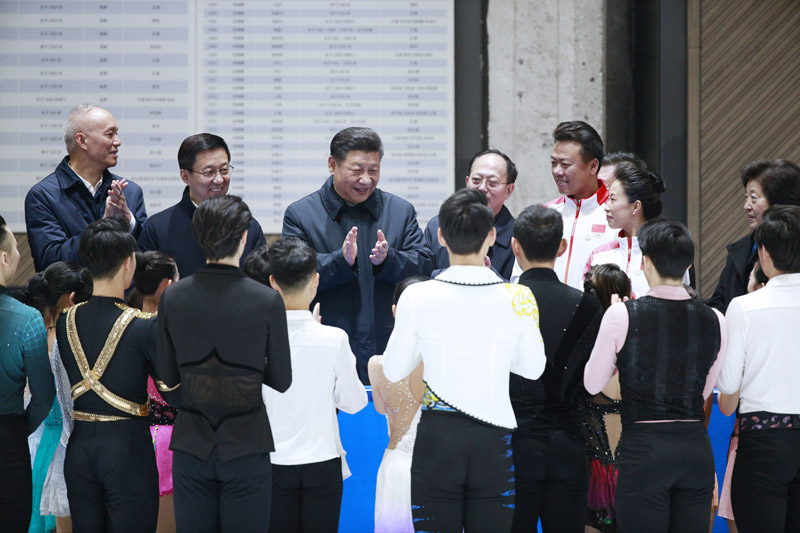 随后,习近平来到国家冬季运动训练中心,在短道速滑馆结合展板听取速滑、花滑项目介绍,之后进入馆内察看国家速滑队、花滑队训练备战情况。看到运动员们在冰面上挥洒汗水、刻苦备战,习近平表示赞许,叮嘱他们科学训练、注意安全。习近平步行前往冰壶馆,察看国家冰壶队训练备战情况。运动员、教练员看到习近平来了,争相围拢过来。习近平勉励他们注重选拔培养好人才,增强为国争光的荣誉感,坚定创造佳绩的信心,刻苦训练、全力备战、勇攀高峰,力争实现新的突破。冰壶馆前厅的沙盘,展示了首钢北区和冬奥会滑雪大跳台规划建设情况,习近平边看边问。他强调,体育强则国家强,国家强则体育强。发展体育事业不仅是实现中国梦的重要内容,还能为中华民族伟大复兴提供凝心聚气的强大精神力量。我们要弘扬中华体育精神,弘扬体育道德风尚,推动群众体育、竞技体育、体育产业协调发展,加快建设体育强国。考察结束时,习近平同运动员、教练员和工作人员代表等握手告别,现场响起热烈的掌声。