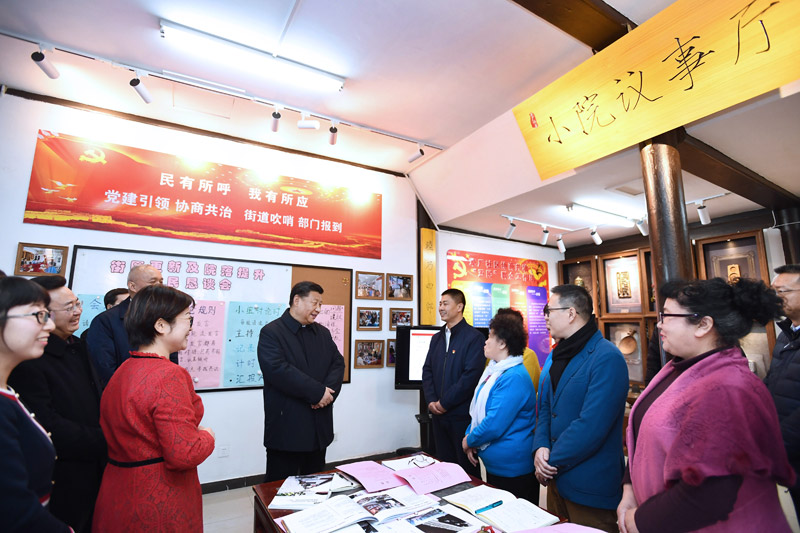 草厂四条“小院议事厅”和物业服务站,是社区公共事务的议事平台,也承担着重要的社区服务功能。习近平对这种做法表示赞赏。习近平同正在议事的居民亲切交谈,一起回顾改革开放以来发生的巨大变化。他指出,设立“小院议事厅”,“居民的事居民议,居民的事居民定”,有利于增强社区居民的归属感和主人翁意识,提高社区治理和服务的精准化、精细化水平。习近平希望这里的老街坊们适应新的生活环境,养成文明健康的生活方式,搞好垃圾分类和环境卫生。接着,习近平来到物业服务站,看望慰问了街道、社区工作人员和物业员工,希望他们坚守岗位、心系群众,为大家度过一个平安祥和的春节做好服务。走出草厂四条胡同,附近的居民们挤满了街道,大家热烈鼓掌,纷纷向总书记问好。习近平给大家拜年,并向全国各族人民致以新春祝福,祝各族人民不断过上更好生活,祝国家日益繁荣昌盛,祝人民家和业兴、新春愉快!习近平乘车离开时,街道两旁挤满了群众,大家热烈欢呼和鼓掌。习近平频频向大家挥手致意。