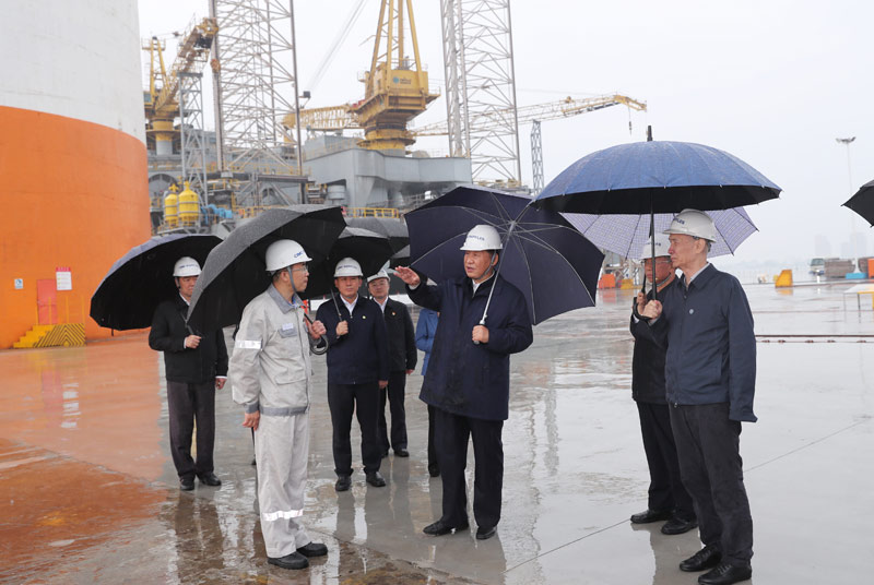 6月13日下午,习近平冒雨来到中集来福士海洋工程有限公司烟台基地。“蓝鲸1号”钻井平台巍峨伫立、“泰山”龙门吊高耸入云,习近平撑着伞边走边看,详细了解企业走自主创新发展之路、开展高端海洋工程设备自主设计研发制造情况。听说“蓝鲸1号”去年创造了可燃冰开采时间和产量两项世界纪录,习近平鼓励他们继续努力。总书记同现场的工人们一一握手,他说,基础的、核心的东西是讨不来买不来的,要靠我们自力更生、自主创新来实现。我看你们有这个信心,希望你们迎难而上、再接再厉。