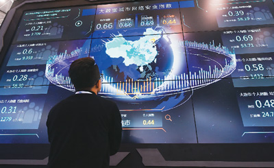 图为参观者在贵州贵阳观看“城市网络安全指数”的大数据展示屏。新华社记者 欧东衢 摄