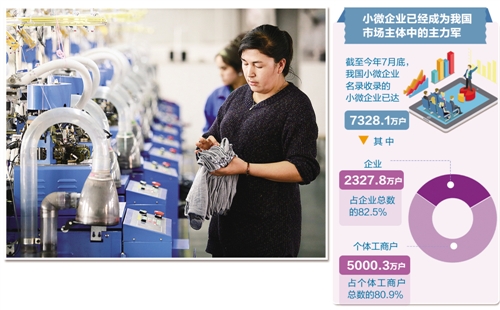 2014年以来,我国3年间平均每天新增市场主体超过4万家,其中新登记企业近1.4万户,企业活跃度保持在70%左右。截至今年7月底,我国小微企业名录收录的小微企业已达7328.1万户,其中,企业2327.8万户,占企业总数的82.5%;个体工商户5000.3万户,占个体工商户总数的80.9%。小微企业已经成为我国市场主体中的主力军,成为扩大就业的重要支撑。