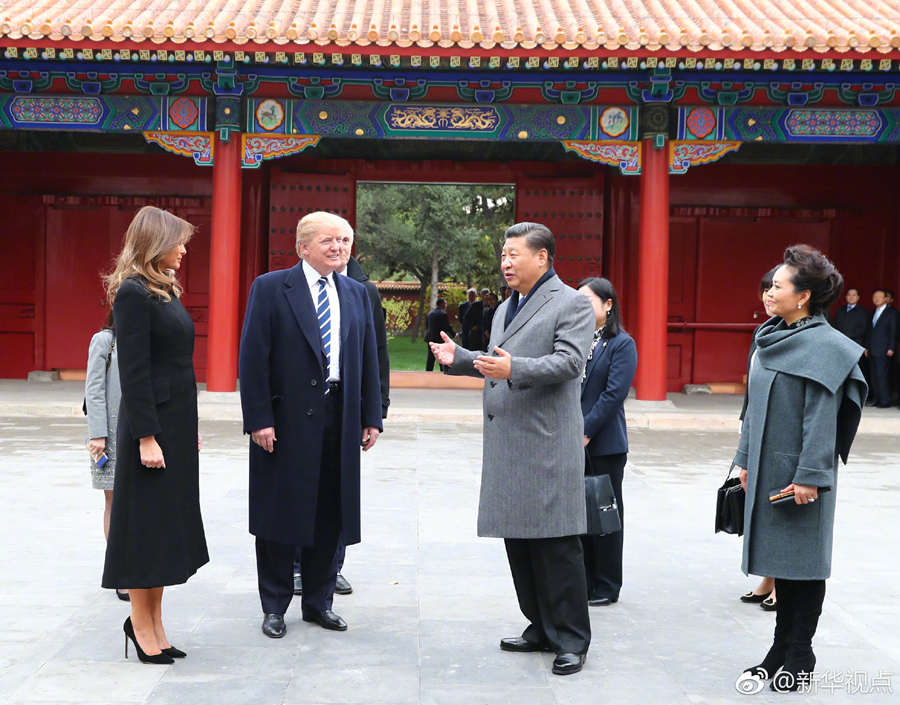 季秋时节,故宫红垣溢彩,黄瓦流光。习近平和夫人彭丽媛在故宫宝蕴楼迎接特朗普和夫人梅拉尼娅。两国元首夫妇互致问候,亲切寒暄,共同步入宝蕴楼落座茶叙。