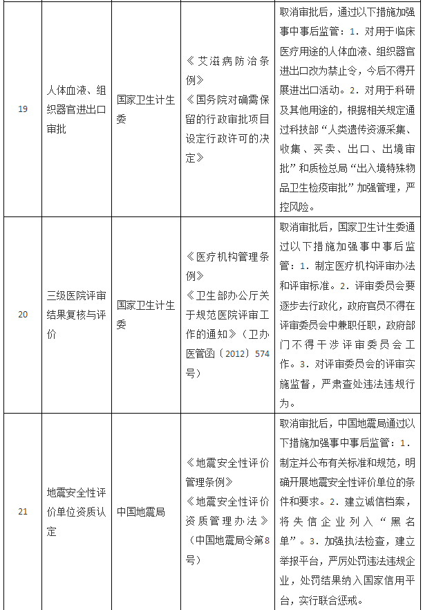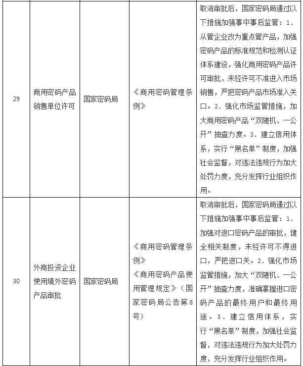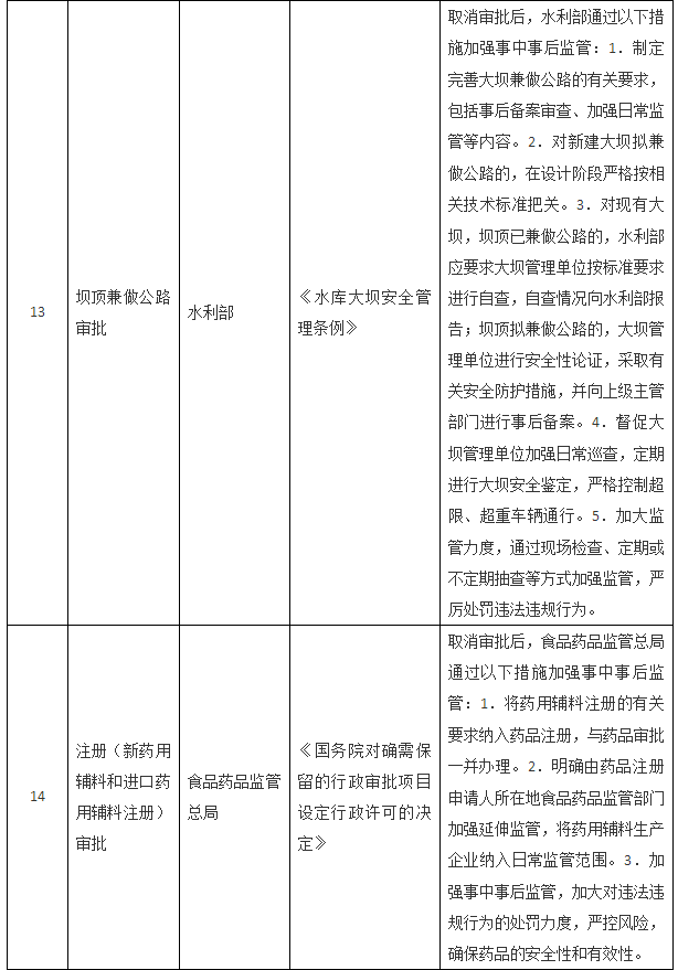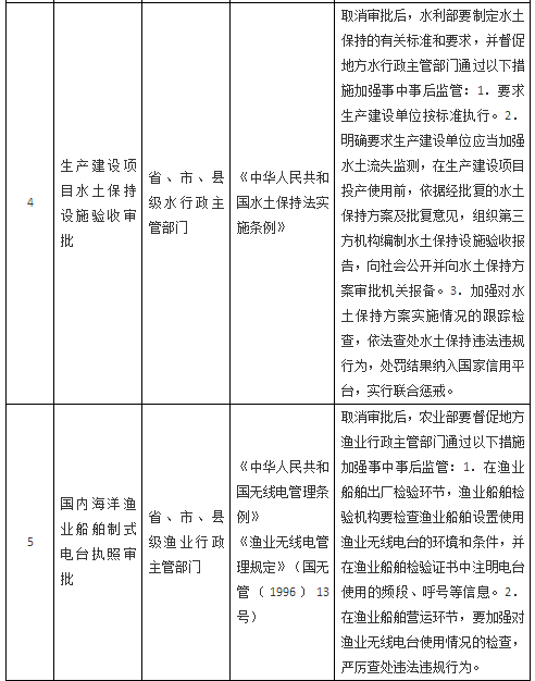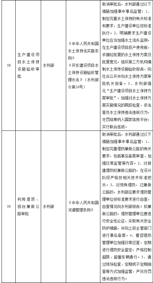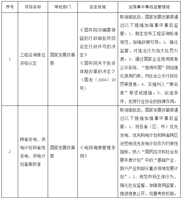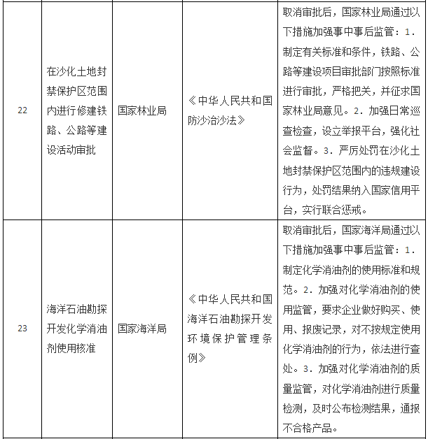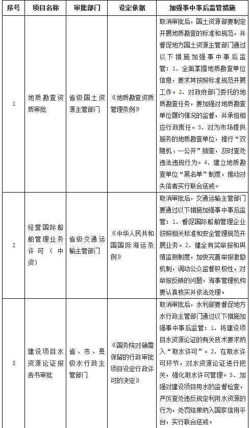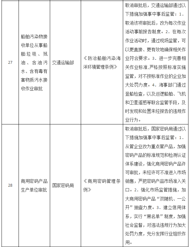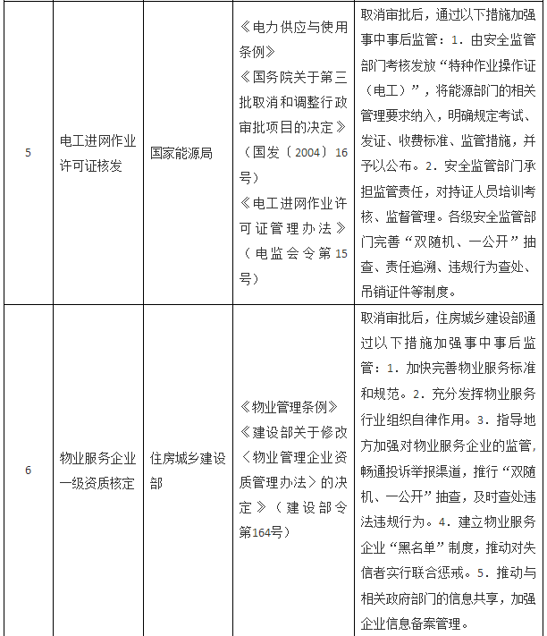 以上公布取消的行政许可事项,其中市场已具备自我调节能力的事项改革后,相关部门的管理职能要重点转向制定行业标准规范,加强事中事后监管,惩处违法违规行为,维护市场秩序;由同一部门对相同内容进行重复审批的事项改革后,相关部门在削减重复审批、合并办事环节的同时,要进一步强化保留审批事项的准入把关作用,发挥认证管理的积极作用,落实监管责任,防止出现监管盲区;由不同部门多道审批改为负主要责任的部门一道审批的事项改革后,不再实施审批的部门负责制定有关行业标准规范,负责审批的部门按标准规范审核把关,遇到特殊疑难问题通过内部征求意见解决,部门间要优化工作流程,压缩审批时限,便利企业办事。改革涉及的部门要制定完善事中事后监管细则,自本决定发布之日起20个工作日内将适宜公开的向社会公布并加强宣传、确保落实。各地区、各部门要抓紧做好衔接工作,认真落实事中事后监管责任,坚决维护公平公正的市场秩序。