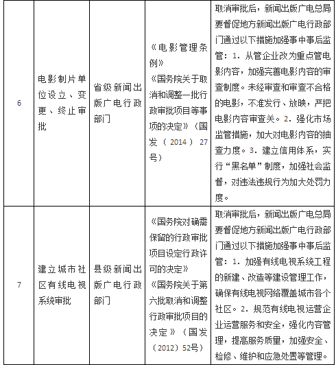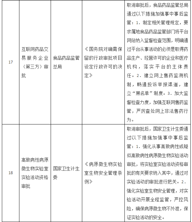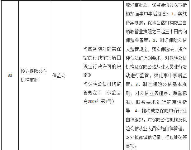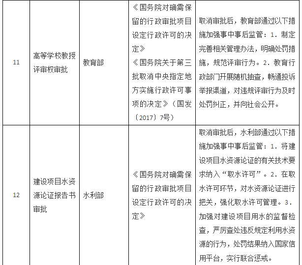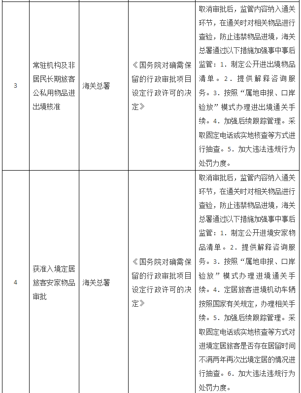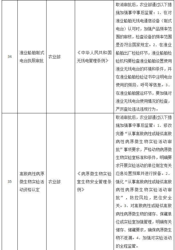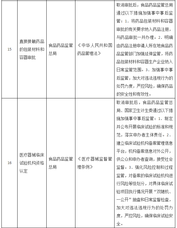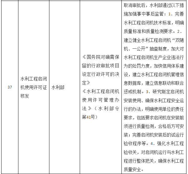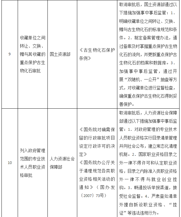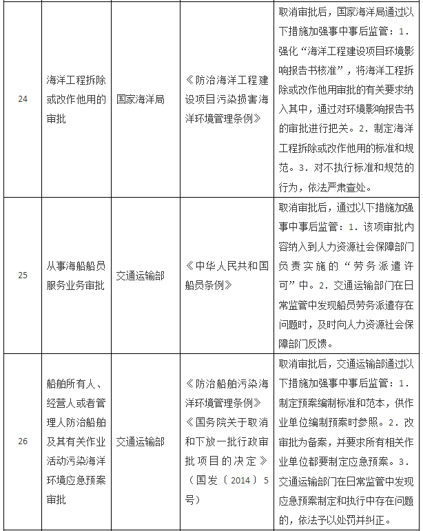 以上公布取消的行政许可事项,其中市场已具备自我调节能力的事项改革后,相关部门的管理职能要重点转向制定行业标准规范,加强事中事后监管,惩处违法违规行为,维护市场秩序;由同一部门对相同内容进行重复审批的事项改革后,相关部门在削减重复审批、合并办事环节的同时,要进一步强化保留审批事项的准入把关作用,发挥认证管理的积极作用,落实监管责任,防止出现监管盲区;由不同部门多道审批改为负主要责任的部门一道审批的事项改革后,不再实施审批的部门负责制定有关行业标准规范,负责审批的部门按标准规范审核把关,遇到特殊疑难问题通过内部征求意见解决,部门间要优化工作流程,压缩审批时限,便利企业办事。改革涉及的部门要制定完善事中事后监管细则,自本决定发布之日起20个工作日内将适宜公开的向社会公布并加强宣传、确保落实。各地区、各部门要抓紧做好衔接工作,认真落实事中事后监管责任,坚决维护公平公正的市场秩序。