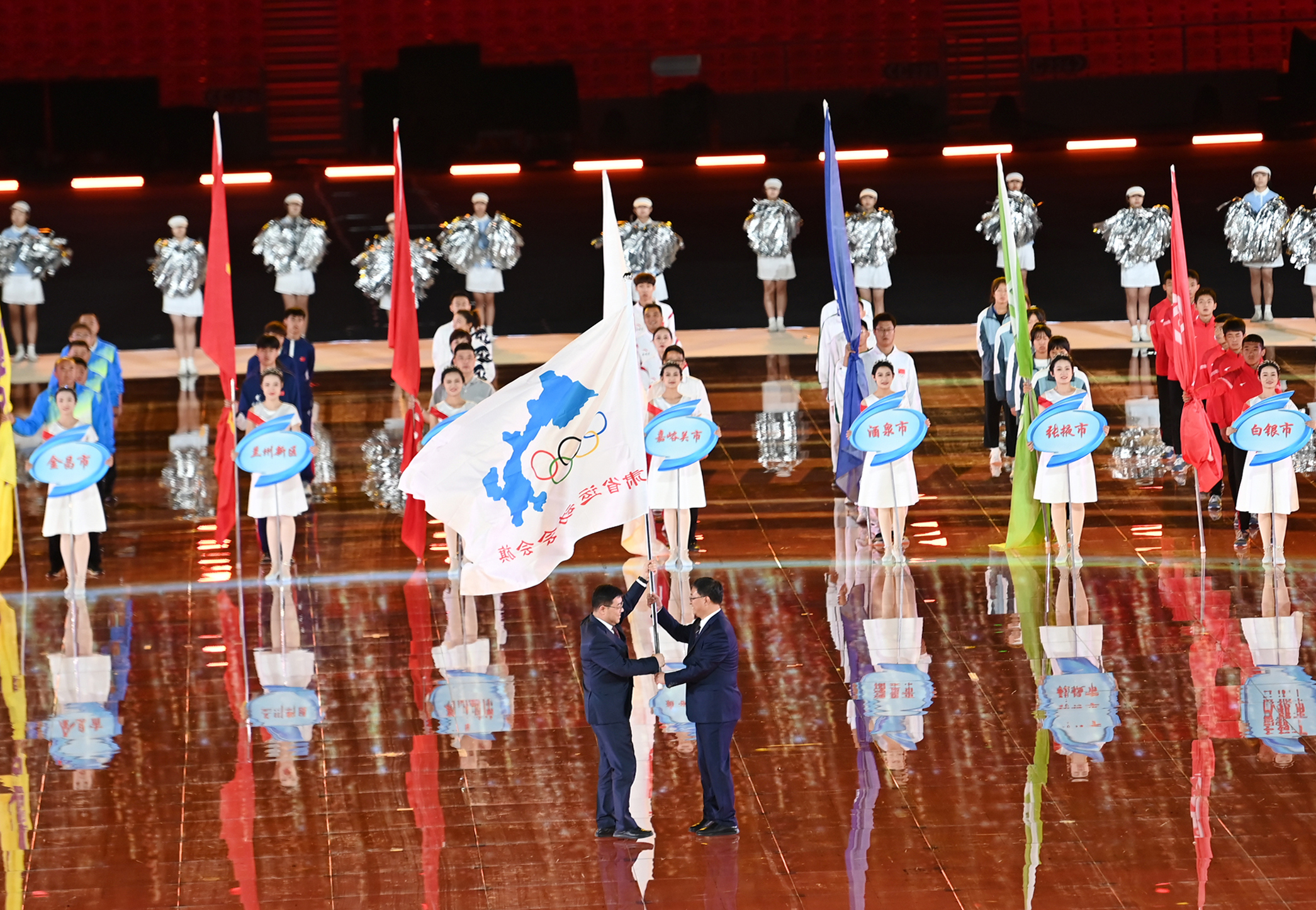 兰州市与甘肃省第十六届运动会主办城市定西市交接会旗,并播放了定西市宣传片。
