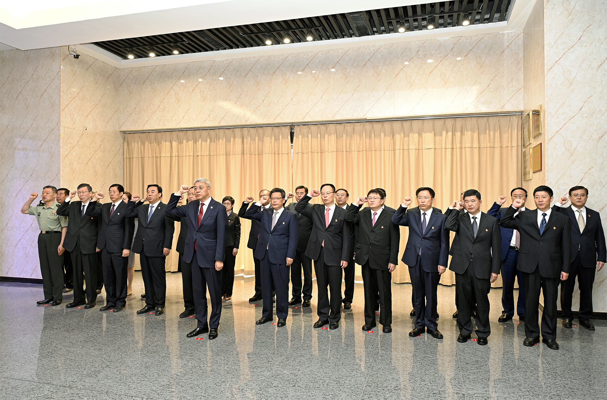 参观结束后,尹弘、任振鹤等来到纪念馆序厅。面向鲜红的中国共产党党旗,尹弘举起右拳,带领党员领导同志重温入党誓词:“我志愿加入中国共产党,拥护党的纲领,遵守党的章程,履行党员义务,执行党的决定,严守党的纪律,保守党的秘密,对党忠诚,积极工作,为共产主义奋斗终身,随时准备为党和人民牺牲一切,永不叛党。”铿锵有力的誓言响彻大厅。