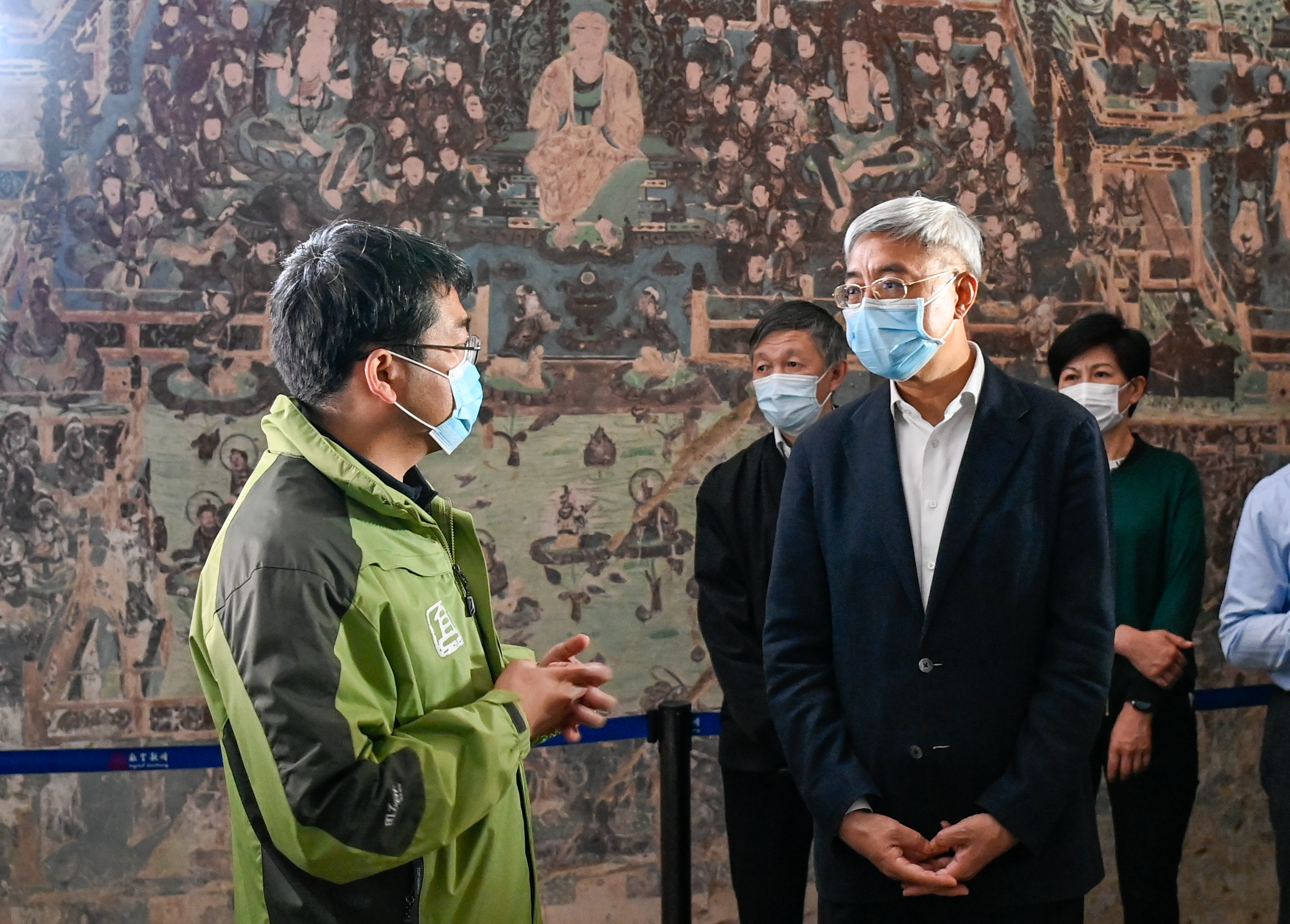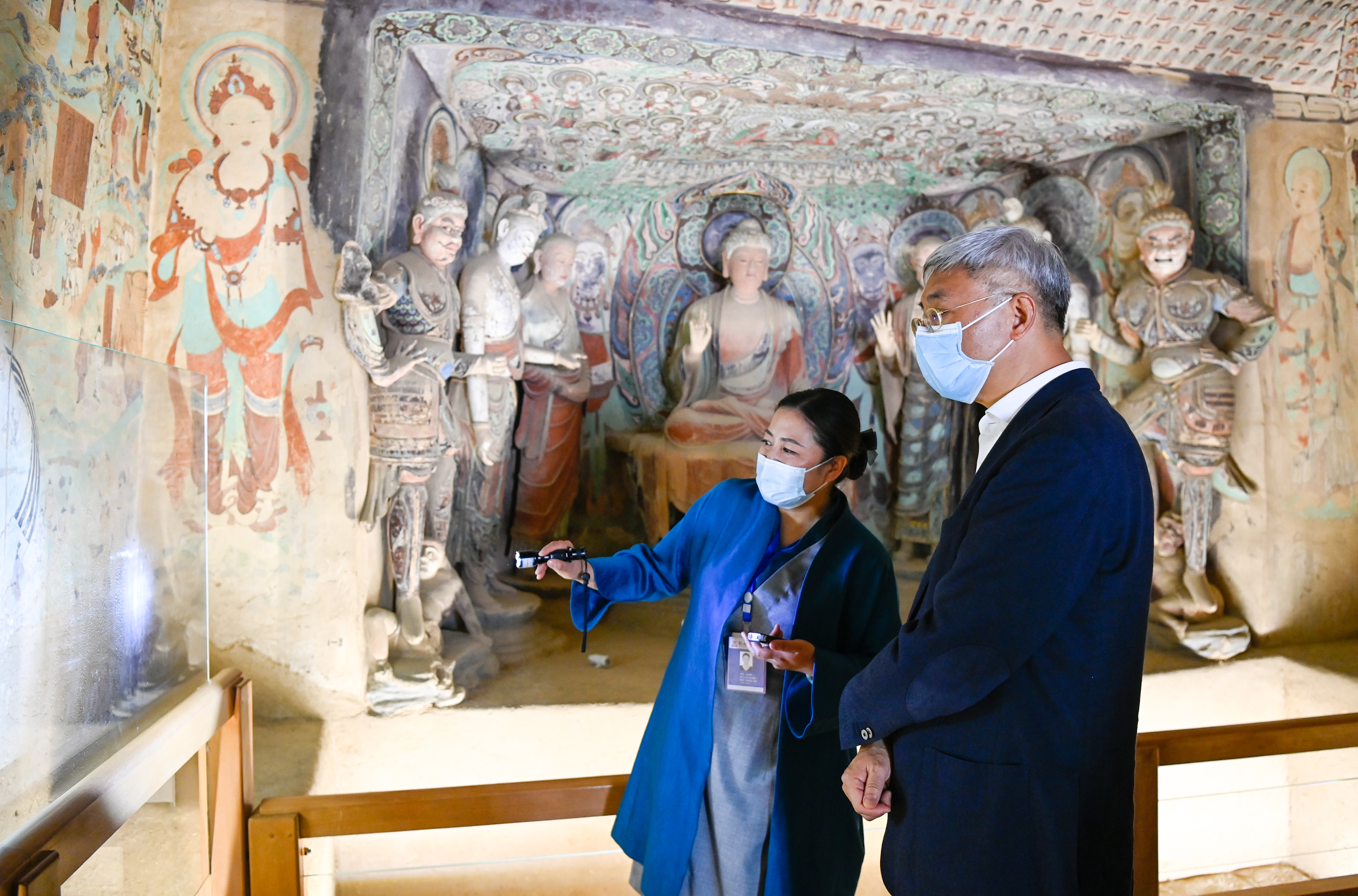 敦煌莫高窟是全国重点文物保护单位、世界文化遗产。尹弘调研了莫高窟文物保护利用和数字化展示情况,走进洞窟同正在作业的壁画修复师亲切交流,了解壁画保护修复等情况。他强调,要深入贯彻落实习近平总书记在敦煌研究院座谈时的重要讲话精神,传承和弘扬“莫高精神”,充分发挥科研队伍专业化优势,运用先进理念和技术手段提高保护水平,把莫高窟保护好,把敦煌文化传承好,把中华优秀传统文化不断发扬光大。要发挥文化遗产、自然资源优势,精心打造独具特色的文化和旅游产品,加大宣传推介力度,提升旅游服务品质,促进文化旅游深度融合,实现相互促进、相得益彰。