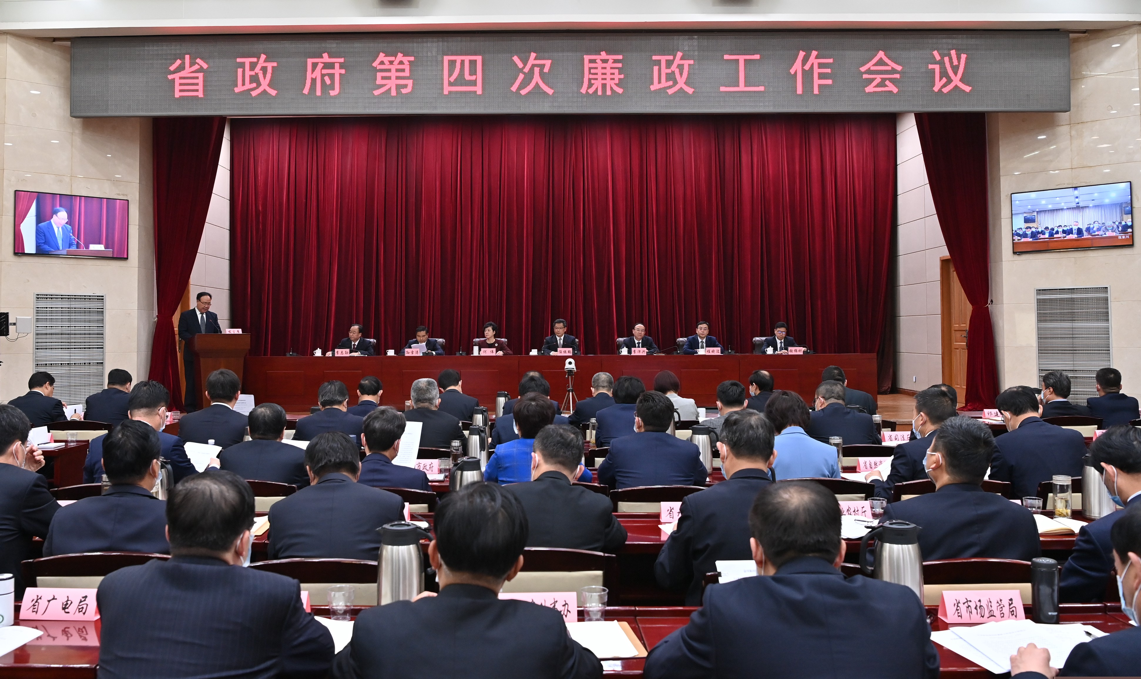 省政府第四次廉政工作会议4月26日在兰州召开,省委副书记、省长任振鹤主持并讲话。他强调,要深入贯彻习近平总书记在十九届中央纪委五次全会上的重要讲话精神和国务院第四次廉政工作会议精神,认真落实省纪委十三届五次全会各项部署要求,坚定政治方向,保持政治定力,以锲而不舍的韧劲、踏石留印的狠劲把政府系统党风廉政建设和反腐败工作推向深入,为推动全省“十四五”发展开好局起好步提供坚实有力的纪律作风保障。