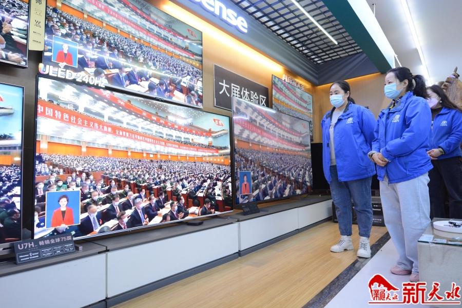 商场工作人员收看党的二十大开幕会盛况(摄影:孙镇)