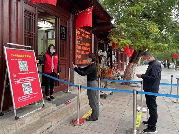 按照天水市国庆假期文旅行业安全生产疫情防控假日市场工作会议和假日值班专题会议安排,全市文旅系统认真贯彻国家、省市联防联控机制部署,落实疫情防控任务、筑牢疫情防控防线,按照“预约、错峰、限量”的疫情防控要求,坚持“外防输入,内防反弹”总策略和“动态清零”总方针不动摇,紧抓安全生产和疫情防控不放松,坚决防止疫情通过文化和旅游途径传播扩散,通过设立警示牌、温馨提示等方式,全面落实佩戴口罩、实名登记、体温测量、一米线等常态化疫情防控措施,保持合理社交距离,同时各景区景点做好日常消毒杀菌工作,加强聚集游客分流疏导,确保国庆假日文化旅游市场安全、平稳、有序进行。