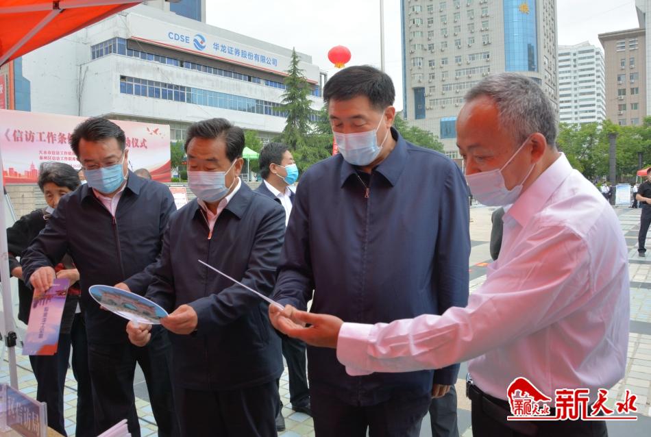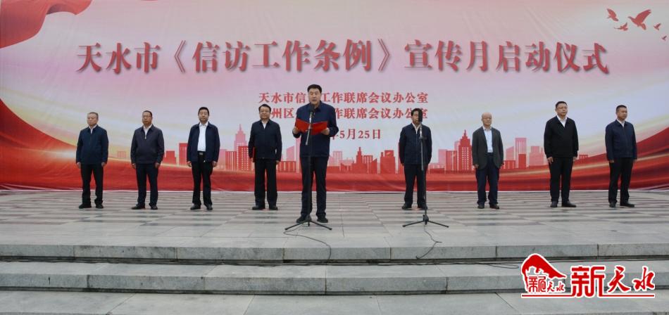 新天水讯【记者马凯】5月25日,以“贯彻信访工作新《条例》,坚持人民信访为人民”为主题的《信访工作条例》宣传月启动仪式在秦州区龙城广场举行。市委常委、政法委书记刘天波讲话并宣布全市宣传月活动正式启动,市人大常委会副主任索鸿宾。市政协副主席董仲奇出席活动,副市长、市公安局局长郭庆祥主持启动仪式。