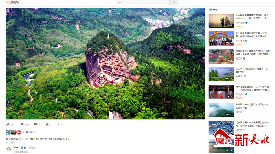 四是线上宣传,旅游形式更为丰富。在落实好疫情常态化要求的同时,为丰富市民“五一”本地游、周末游、一日游等“天水人游天水”活动,我市推出了20条一日游线路,7条精品旅游线路,40个特色美食体验地,20处乡村旅游推荐点,23个星级旅游饭店以及一系列旅游景区景点优惠政策。同时,依托新天水、爱天水、云游天水等本地新媒体平台以及微游甘肃、今日头条、新华网、网易新闻、腾讯新闻、百度APP等平台持续推送胡氏民居、麦积烟雨、石门云海、甘谷大像山、武山油菜花海、清水春景、关山牧场、凤山赏花等旅游图文资源300余条,使游客们隔着屏幕便可欣赏天水春天的美丽景色,体验当地的风土人情,感受到羲皇故里的浓厚文化底蕴。通过全方位、多层级、宽领域的宣传,进一步扩大了天水文化旅游对外影响力。