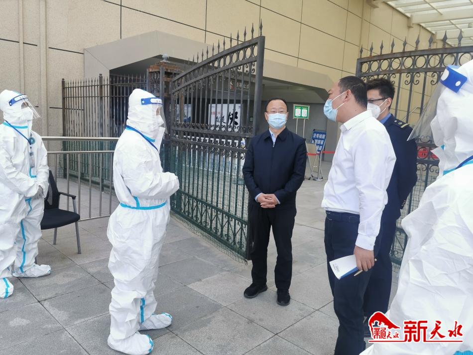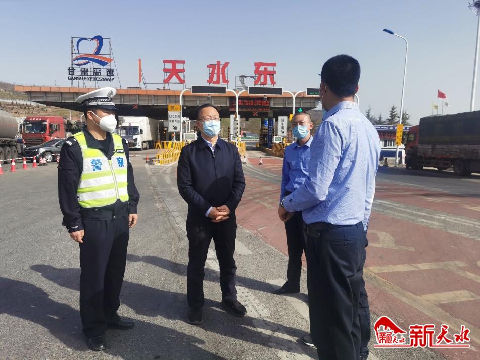 新天水讯【记者辛闻】3月15日,市委常委、常务副市长贾义翔先后到秦州区官泉小区、高铁南站、天定高速天水东出口、市第五人民医院、华辰大酒店等地,实地督导疫情防控交通卡口核酸检测、集中隔离、封控管控、物资保障供应、项目建设等情况,并看望慰问一线抗疫人员。