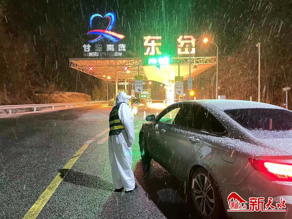 2月6日凌晨,天空依然雪花飘飘,早上7点,宝天高速天水东收费站副站长杨艳丽在圈里公布了“樱桃红”视频号关于全省范围内高速临时管制的信息,提醒说:甘肃省内大部分高速还在临时管制中,大家还是就近休息。信息配了一张图片,灯光下,一位身着制服和黄马甲的姑娘,站在风雪的收费站前,浑身落满了雪花,驱散不去的寒冷不得不使她把双手抱拢放在胸前取暖,她站得那么坚定,那么倔强,因为她知道,此时的自己就是一道屏障,一道安全的屏障,眼前是他人的幸福,身后是道路的安全。