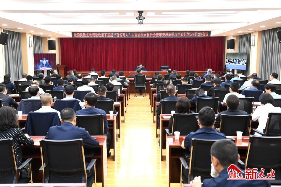 新天水讯【记者王晓馨】5月30日下午,党的民族宗教理论政策下基层“百场万人”大宣讲天水报告会暨市委理论学习中心组学习(扩大)会议召开。省委统战部副部长、省侨联党组书记、省宗教事务局局长秦禾作专题辅导,市委副书记、市委统战部部长杨晓锋主持会议。本次宣讲以视频会议的方式进行,市上设主会场,各县区设分会场。市委、县区委理论学习中心组成员及相关领导同志、天水师范学院相关领导参加会议。