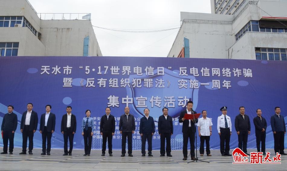 新天水讯【记者 刘晓亚】5月17日上午,天水市举行“5 ·17世界电信日”反电信网络诈骗暨《反有组织犯罪法 》集中宣传活动。市委常委、政法委书记、平安天水建 设领导小组常务副组长、办公室主任邵建斌出席活动, 副市长、市联席会议总召集人郭庆祥作动员讲话。