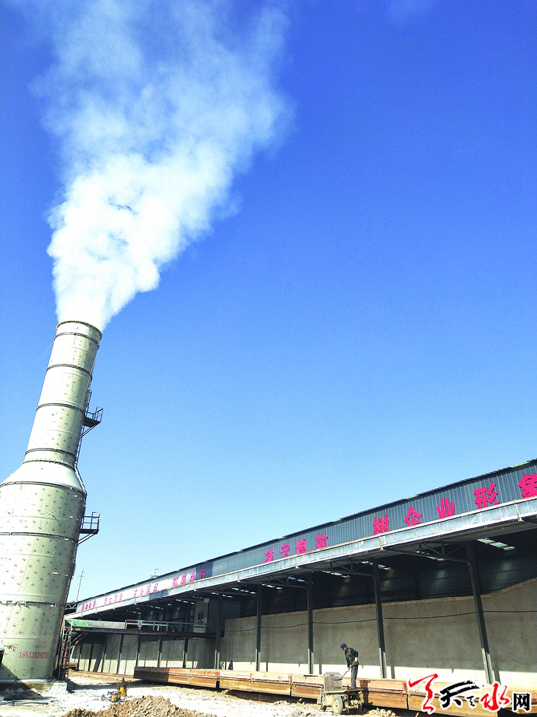 询问项目负责人、甘谷县九源建材有限公司经理张生得知,记者眼中的“大烟囱”原来是脱硫塔,其主要是对工业废气进行脱硫处理,把尘土和有害气体进行化学吸收、分解,然后排放到纳污池里,这样经过多道工序后排放出来的便是记者看到的是环保无污染的白色水汽。
