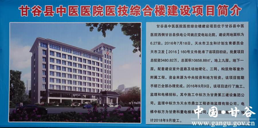 甘谷县中医院成立于1985年,是一所集医疗、科研、预防为一体的二级甲等医院。近年来,县中医院发展迅速,医疗服务质量稳步提升,门诊、住院患者持续增长,2015年,门诊量达5万多人次,业务收入2100多万元。医技综合楼项目工程按照国家二级甲等中医医院标准设计建设,总投资3480万元,总建筑面积近10660平方米,预计2018年9月竣工。