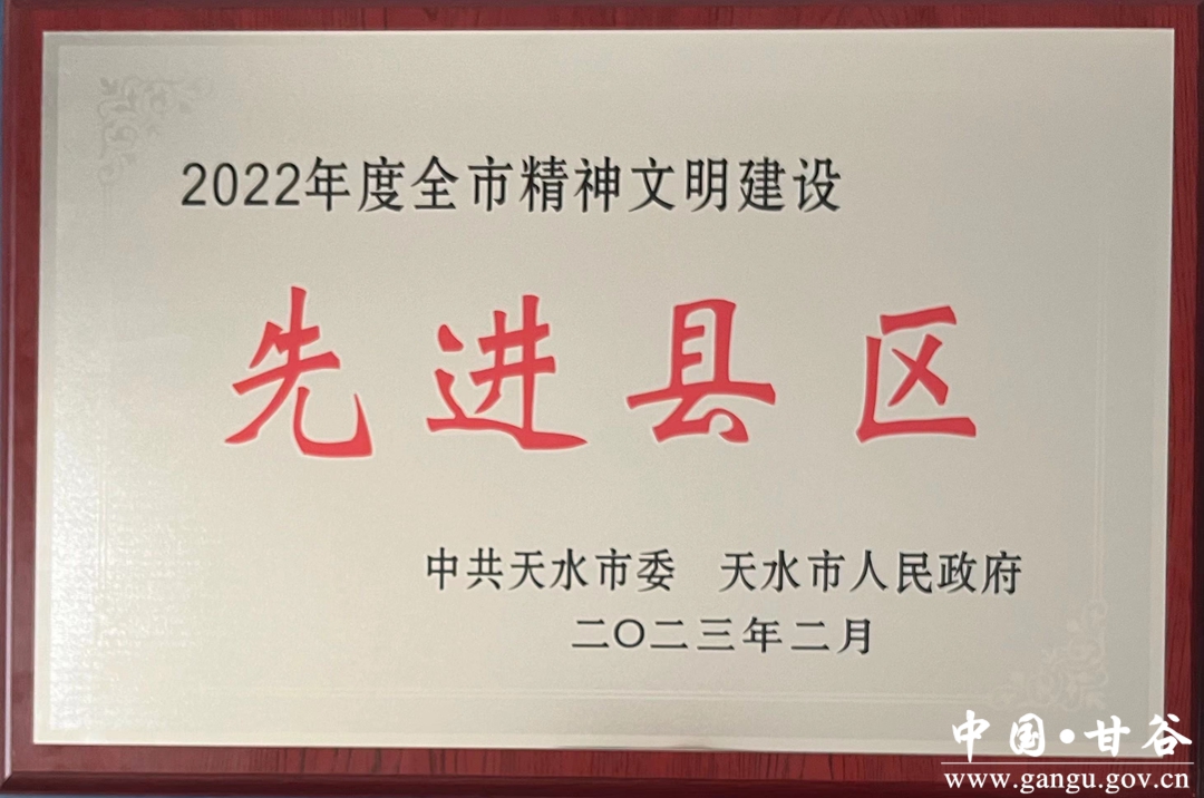 3月6日,天水市精神文明建设工作会议召开,大会对2022年度精神文明建设工作突出的县区进行了表彰。甘谷县获评“2022年度全市精神文明建设先进县区”。