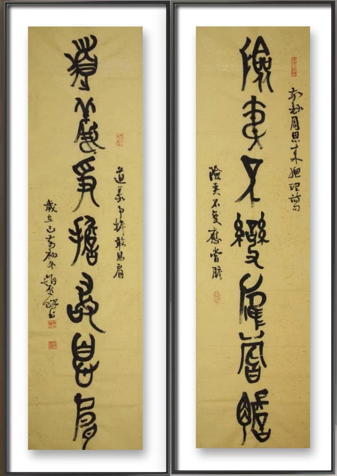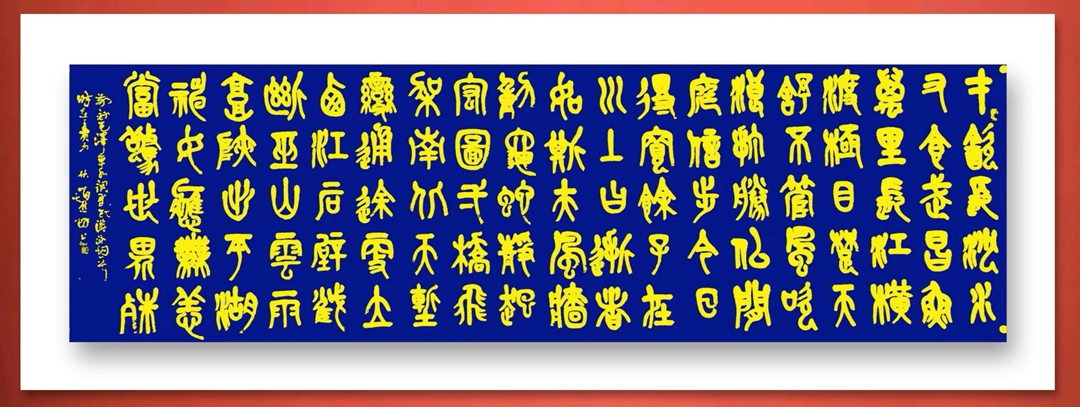 石鼓文为中国最古老的石刻文字,是赵先生近年情有独钟之书体。石鼓出土于宝鸡凤翔,宝鸡市有地名曰石鼓山,并建有石鼓阁。笔者曾供职宝鸡文化系统多年,对于石鼓文也略有知晓。石鼓文集大篆之成,开小篆之先河,是由大篆向小篆衍变而又尚未定型的过渡性字体。石鼓文被历代书家视为习篆书的重要范本,故有"书家第一法则"之称誉。近代书家吴昌硕临写石鼓造诣极深,自成风格。赵先生学篆书而溯其源,追摹石鼓,独家面目,今已初显,续之时日,必有更大成果。