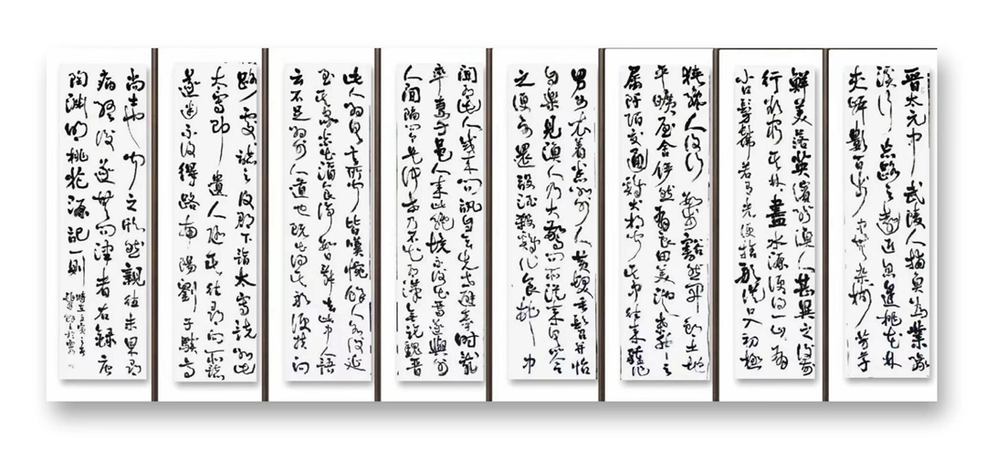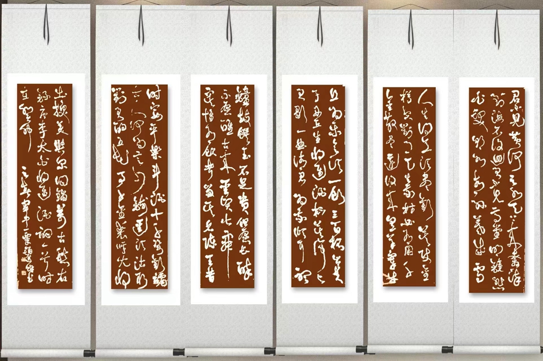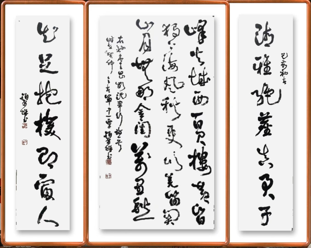 众所周知,草书是诸多书体中最为多姿多态、最具线条艺术魅力的一种书体。正如《草诀歌》中开篇所说:“草圣最为难,龙蛇竞笔端。毫厘虽欲辨,体势更须完”。赵先生草书唐诗五绝四条屏以及书张旭七绝“山中留客”、明代杨基五律“岳阳楼”等,无不笔下恣意纵横,布局疏密得当,融二王之神韵,俱王铎之风采,笔墨放纵,激情奔放,让人想到“矫若游龙,疾若惊蛇,千态万状,不可端倪”。