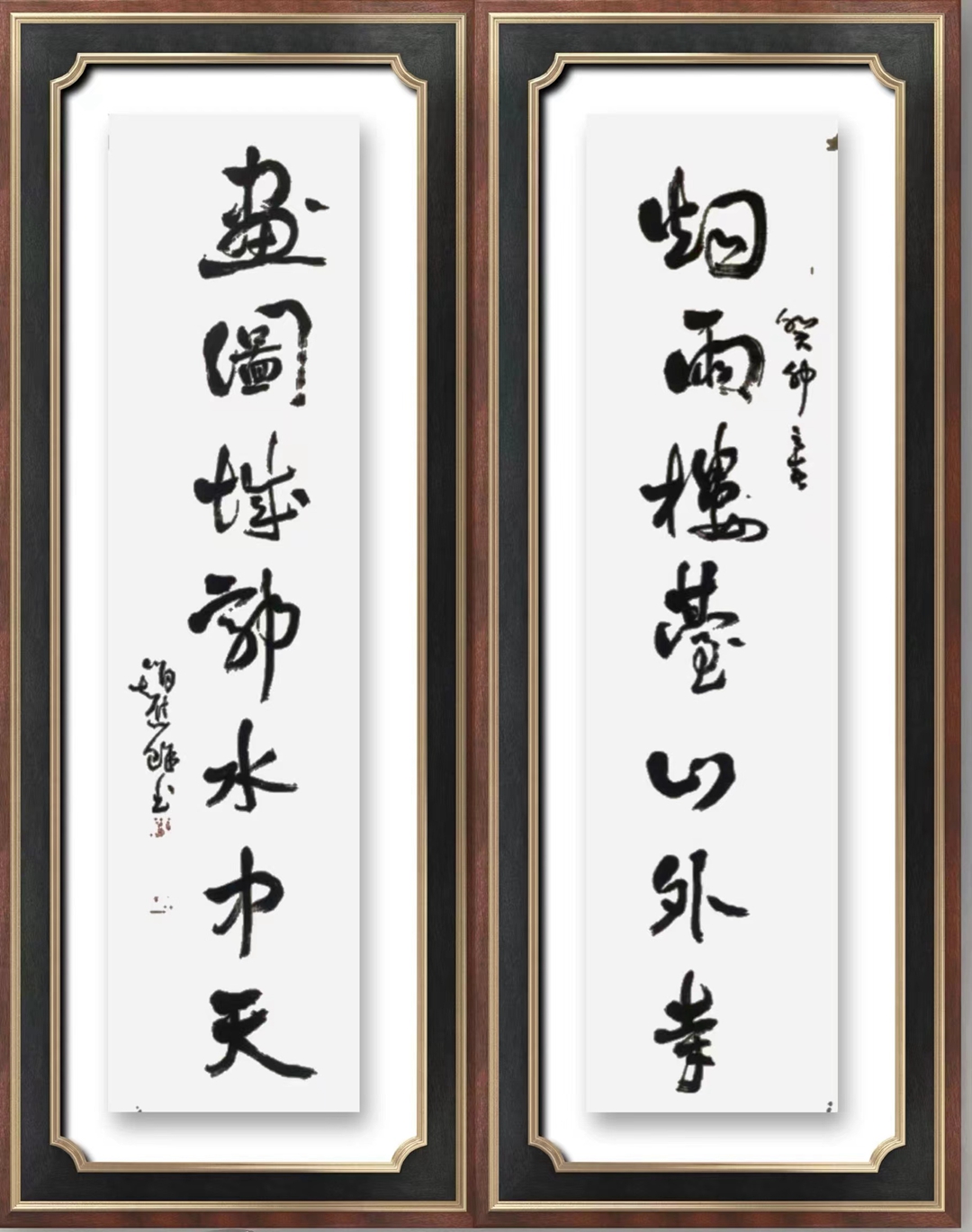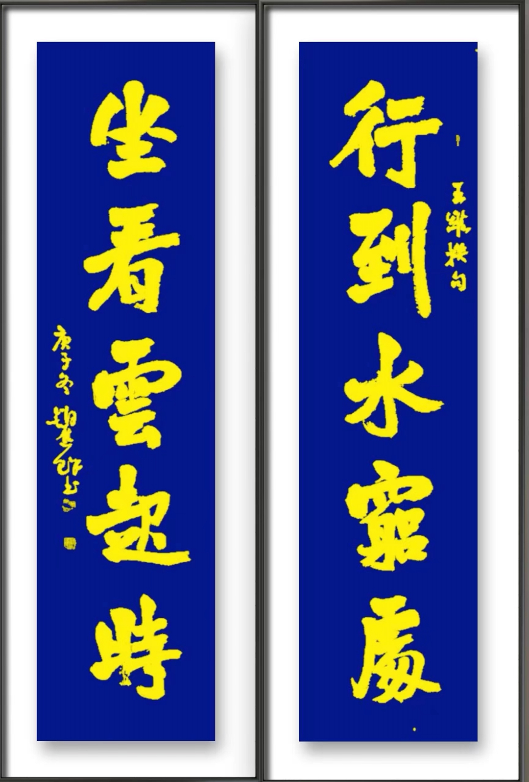 赵先生的行草传统根基牢固,功力深厚,抱朴含真,圆中见方、柔中有刚,儒雅隽秀、流畅清逸,其中近于楷者如对联“行到水穷处,坐看云起时”,大有魏碑刚正风骨。而近于草者如对联“静坐莲池春满袖,晓行花径露沾衣”,又可见何子贞先生笔意,精致秀美,耐人品味,给人以美的享受。