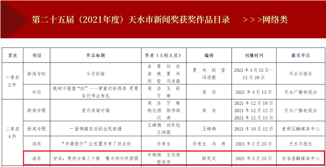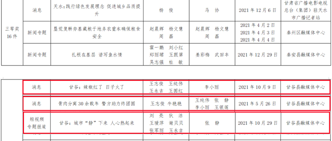 除此之外,甘谷县融媒体中心选送的作品《骨肉分离三十载 警方助力终团圆》分别荣获网络类消息二等奖和广播电视类消息三等奖,《辣椒红了 日子火了》《城市“静“下来 人心热起来》分别荣获广播电视类消息、新媒体类短视频专题报道三等奖。