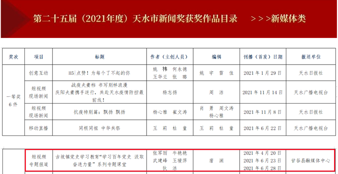日前,天水市委宣传部、天水市新闻工作者协会联合印发了关于表彰第二十五届(2021年度)天水新闻奖获奖作品的决定,甘谷县融媒体中心选送的作品《古坡镇党史学习教育“学习百年党史 汲取奋进力量”系列专题课堂》荣获新媒体类短视频专题报道一等奖。