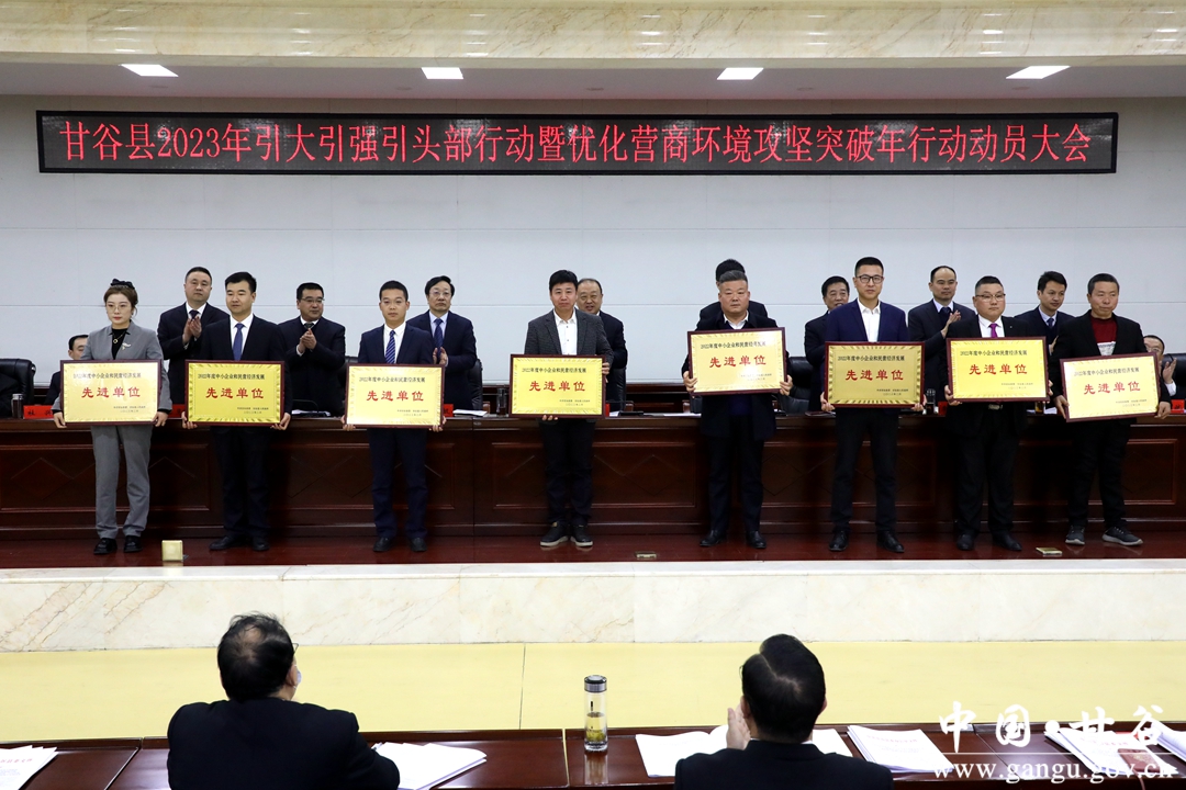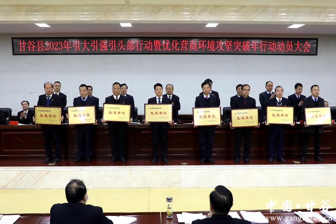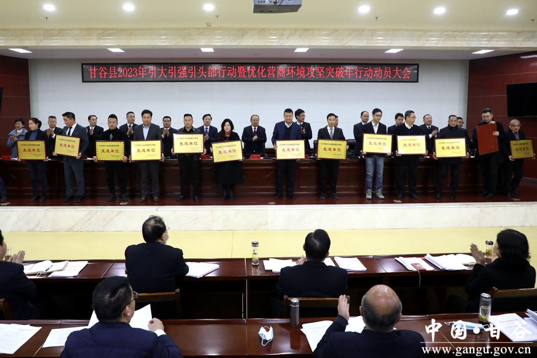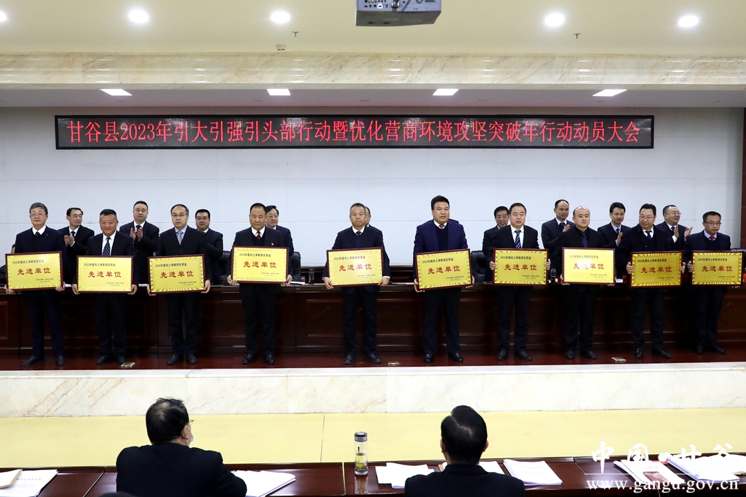 县委副书记、县长孙忠平主持会议。县委副书记林如海宣读《中共甘谷县委、甘谷县人民政府关于表彰2022年度招商引资、向上争取项目资金、优化营商环境、中小企业和民营经济发展先进单位和先进个人的决定》。县委常委、副县长张恒刚通报2022年度全县向上争取财政项目资金情况并宣读《中共甘谷县委办公室、甘谷县人民政府办公室关于分解落实2023年向上争取资金、招商引资到位资金任务的通知》《甘谷县人民政府关于聘请贾伟光等10人为甘谷县招商顾问的通知》。副县长刘强通报2022年度全县招商引资情况。