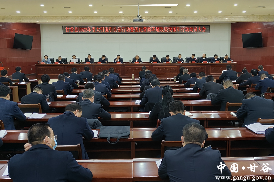 县委书记吴健出席会议并讲话。县委副书记、县长孙忠平主持会议。县委副书记林如海宣读《中共甘谷县委、甘谷县人民政府关于表彰2022年度招商引资、向上争取项目资金、优化营商环境、中小企业和民营经济发展先进单位和先进个人的决定》。县委常委、副县长张恒刚通报2022年度全县向上争取财政项目资金情况并宣读《中共甘谷县委办公室、甘谷县人民政府办公室关于分解落实2023年向上争取资金、招商引资到位资金任务的通知》《甘谷县人民政府关于聘请贾伟光等10人为甘谷县招商顾问的通知》。副县长刘强通报2022年度全县招商引资情况。