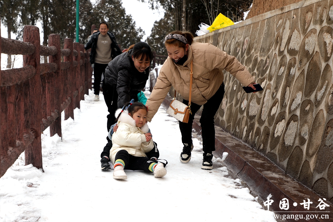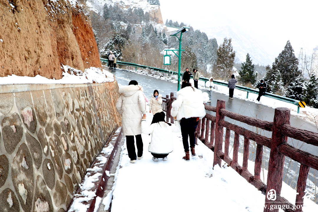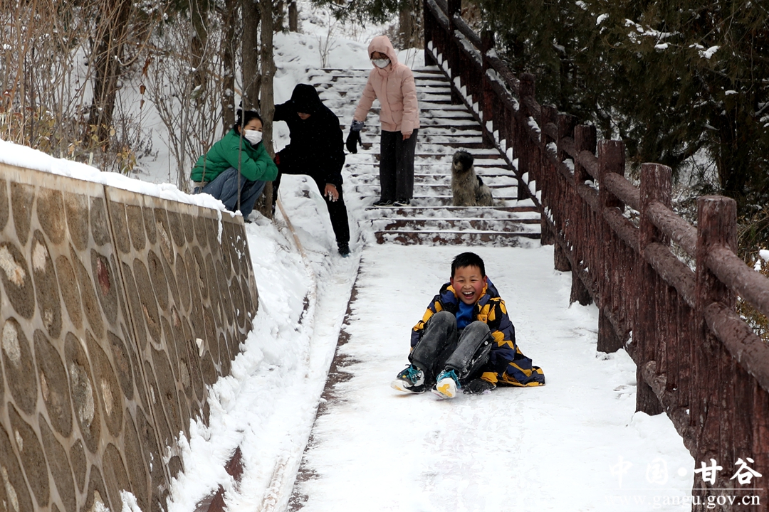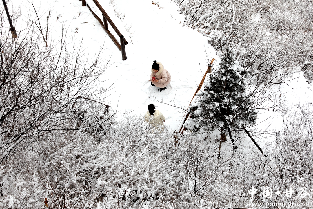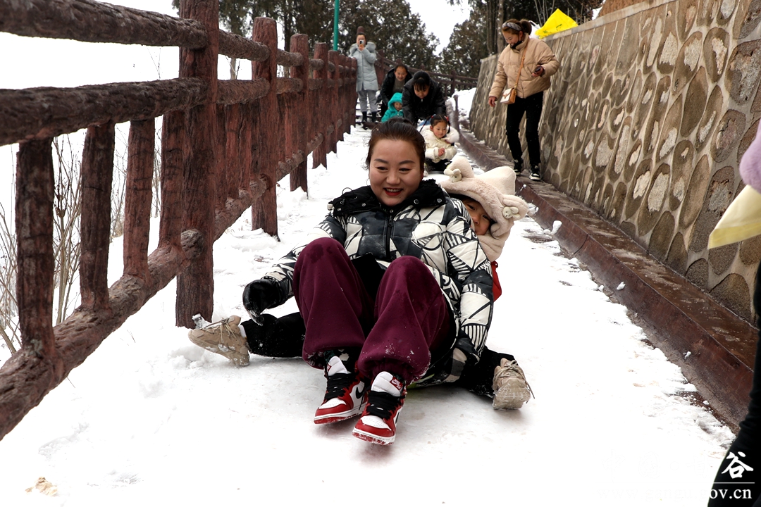 年长者赏雪,一路走,一路自言自语,或者嘴里低吟着什么。小青年踏雪,手持雪球,一路追赶者、打闹着、嬉笑着。女人则始终如一,自拍、互拍,看完之后,不美了重新拍。孩童在这迷人雪景里,已无心思堆雪人,边爬台阶边寻觅,终于找到了一块斜坡地,坡度不大,当滑滑梯正好,妈妈的手提袋成了滑板,滑了一遍、一遍、又一遍,旁边观看的大人也忍不住了,滑一把过个瘾,尖叫声、欢笑声此起彼伏、响彻山谷。