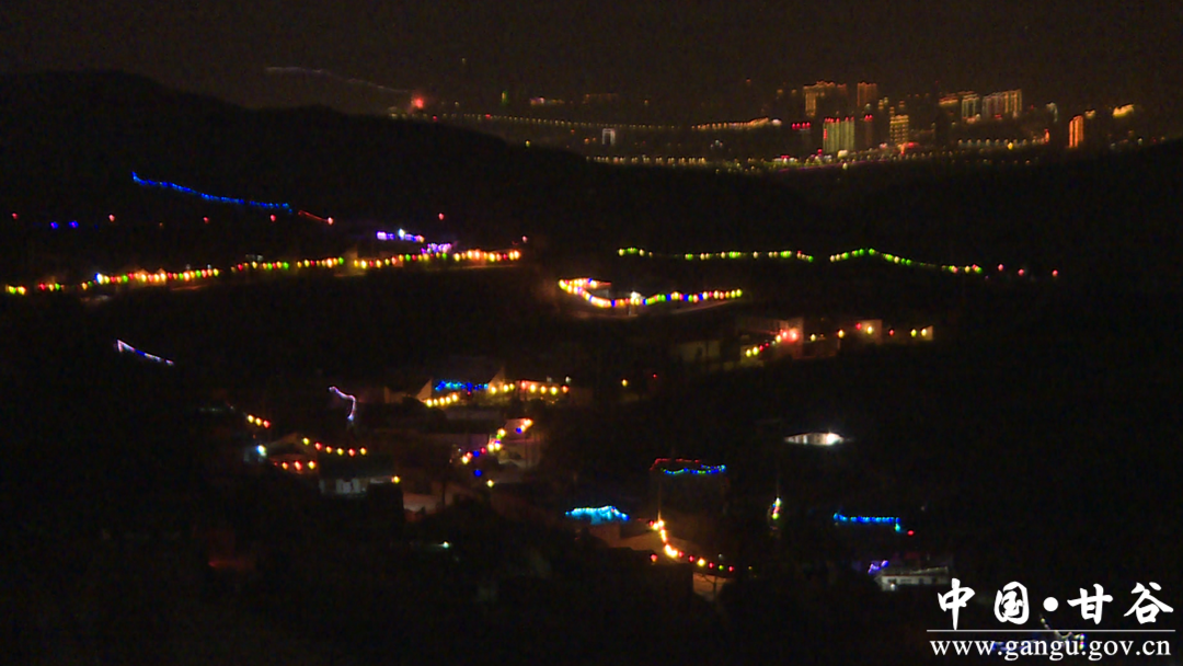 春节期间,刘家山村村民利用山势的自然起伏在各个峁梁挂上了彩灯,打造出了一幅具有立体感、多维度的彩灯景观带,一串串的美轮美奂的灯组把山村的年味装扮的格外浓厚。元宵节当晚,夜幕降临,各个峁梁上的彩灯逐渐亮起,璀璨夺目,流光溢彩。山峁和村庄也随着霓虹的闪烁与颜色变换呈现出各种姿态,与当空的皓月、门前的大红灯笼相映成景,放眼远眺宛若一幅活火龙戏珠图。