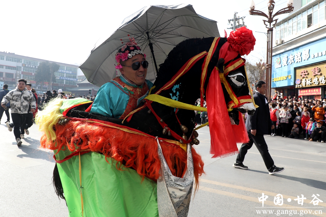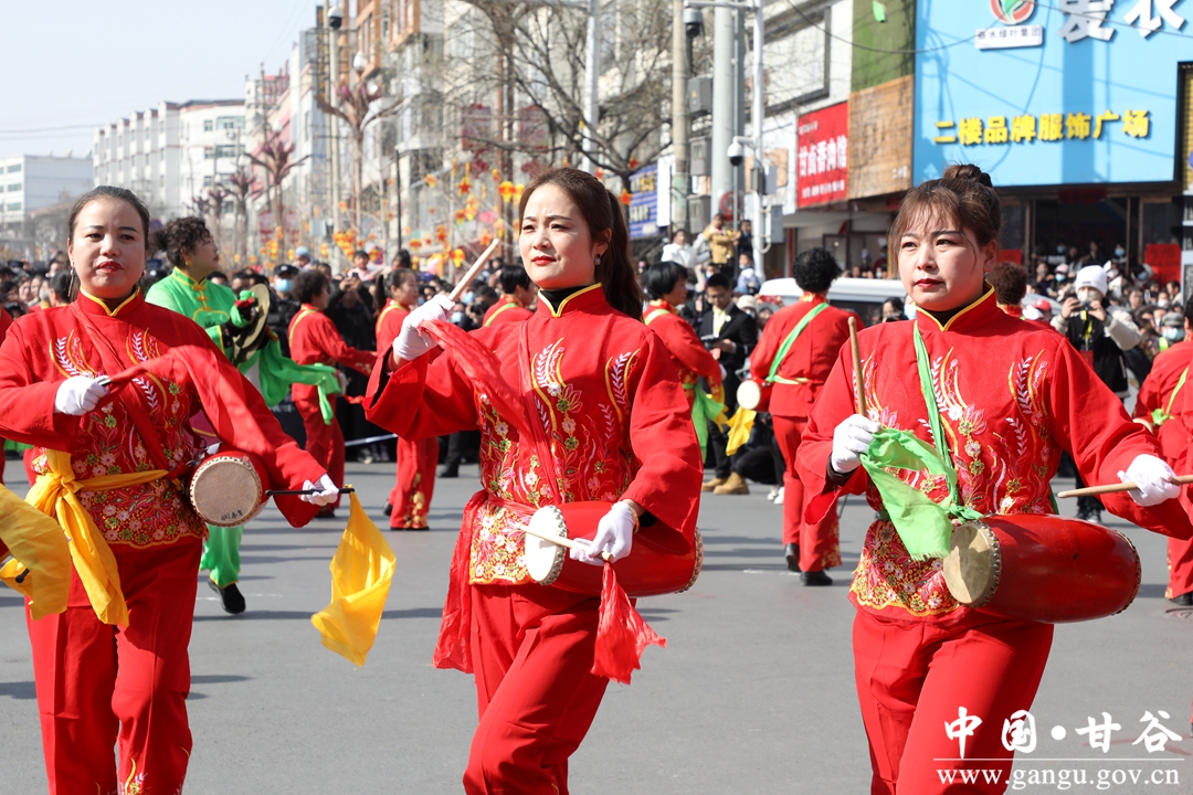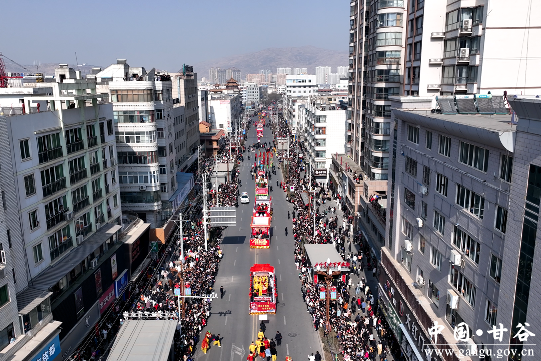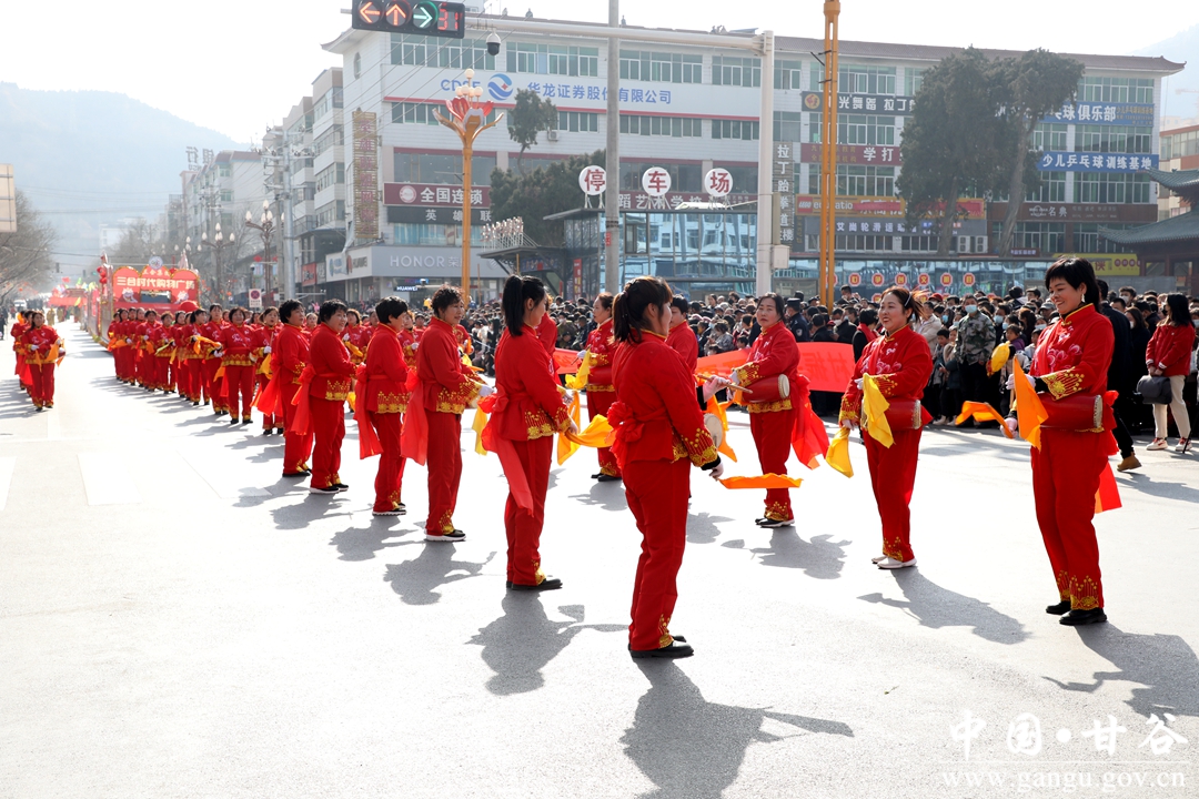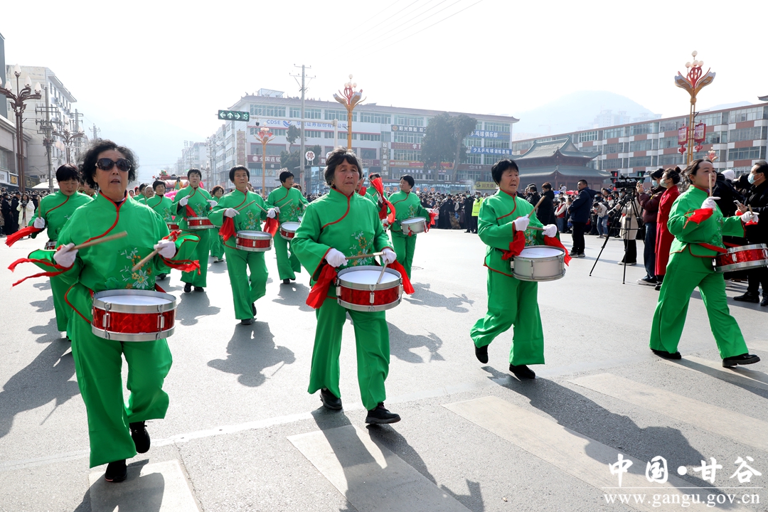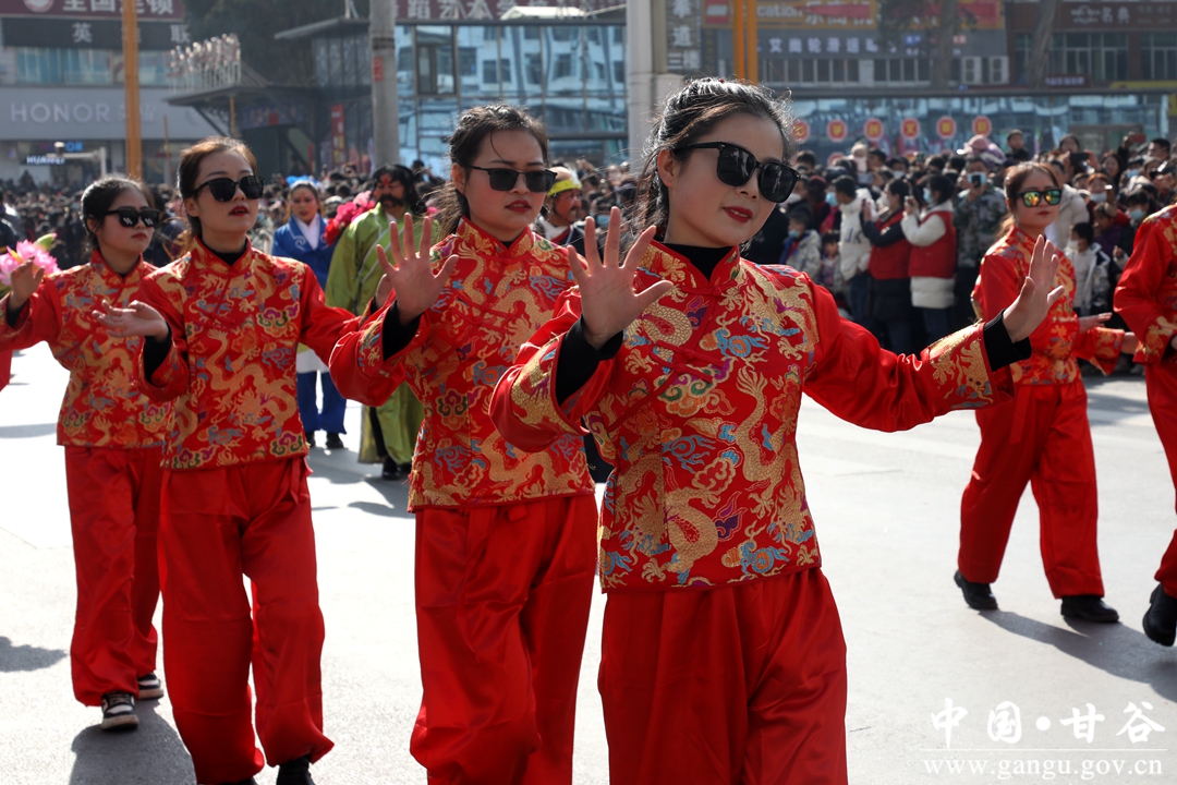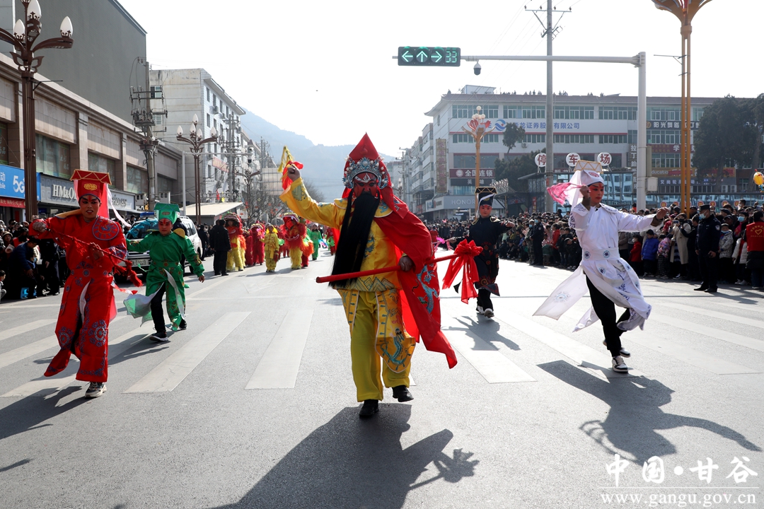 演员们个个喜笑颜开,身着华丽的服饰,精神抖擞、神采飞扬,随着喜庆的歌声舞动着身躯,排踩着欢快的鼓点相继亮相。大气磅礴的太平鼓、辗转腾挪的舞狮、独具特色的旱船、风趣诙谐的舞蹈、花团锦簇的彩车轮番上演,闹红了甘谷的正月天,也闹出了一个多姿多彩、有声有色的新春佳节。
