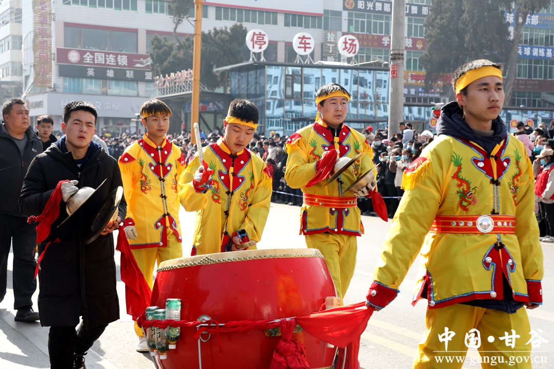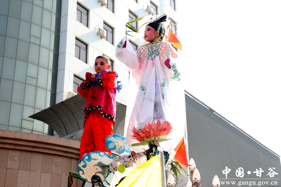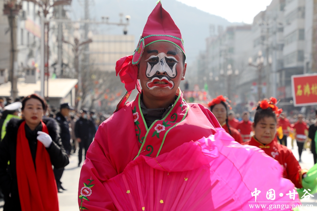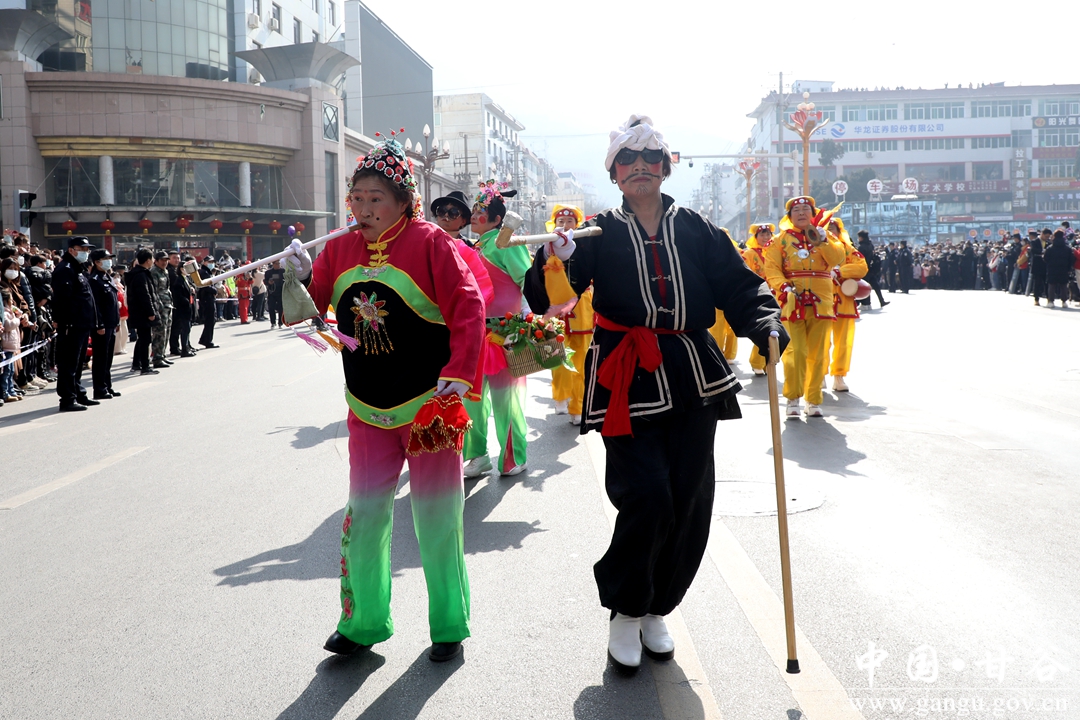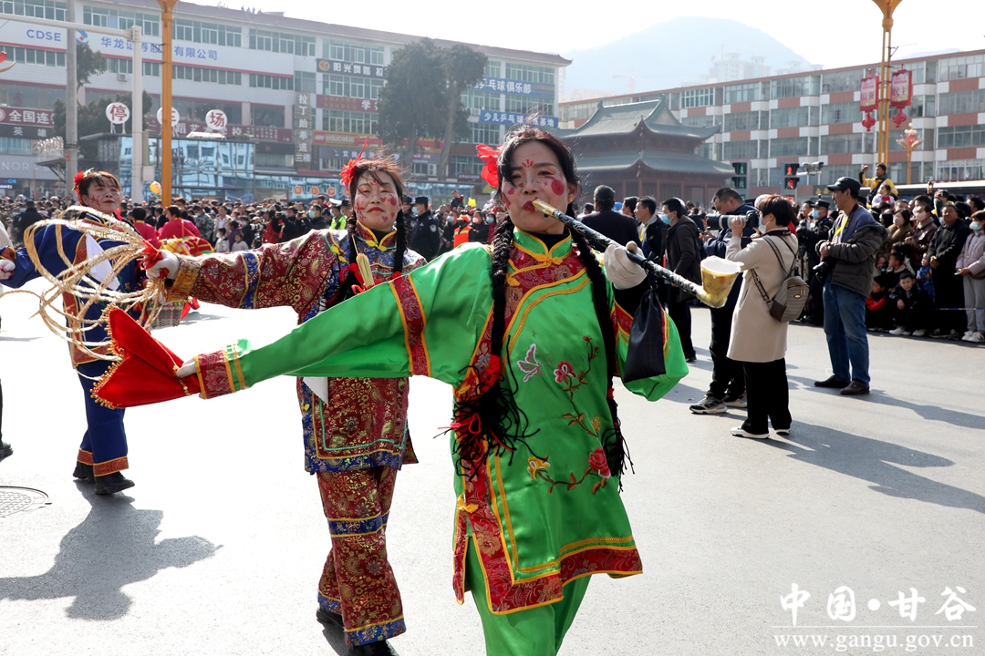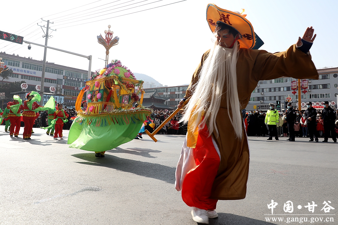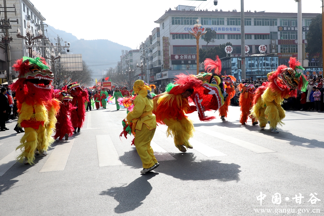 演员们个个喜笑颜开,身着华丽的服饰,精神抖擞、神采飞扬,随着喜庆的歌声舞动着身躯,排踩着欢快的鼓点相继亮相。大气磅礴的太平鼓、辗转腾挪的舞狮、独具特色的旱船、风趣诙谐的舞蹈、花团锦簇的彩车轮番上演,闹红了甘谷的正月天,也闹出了一个多姿多彩、有声有色的新春佳节。