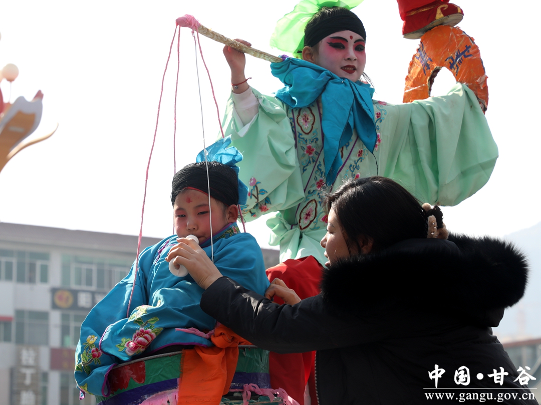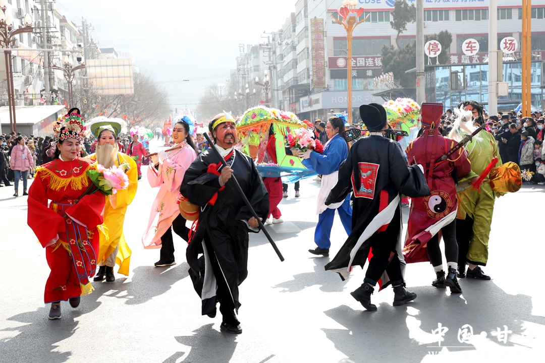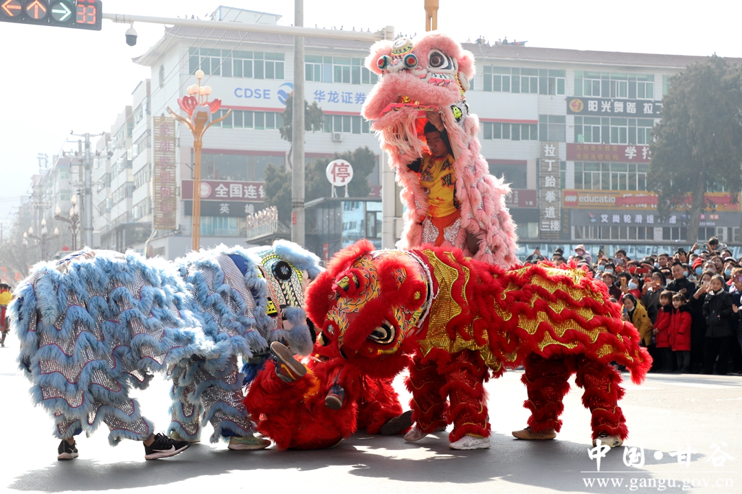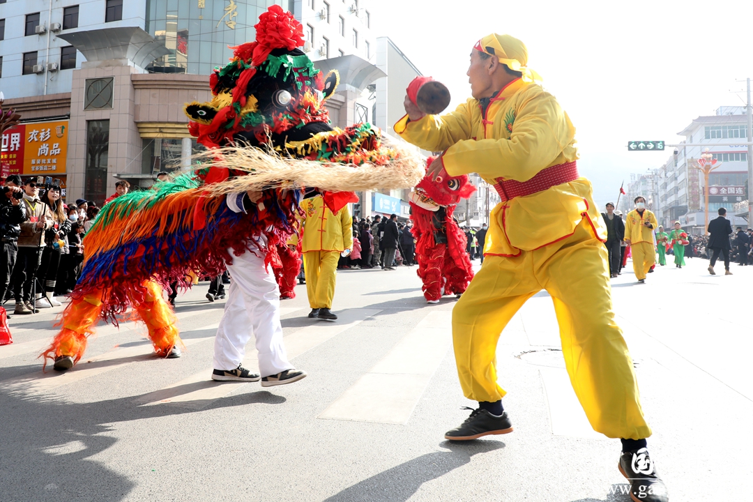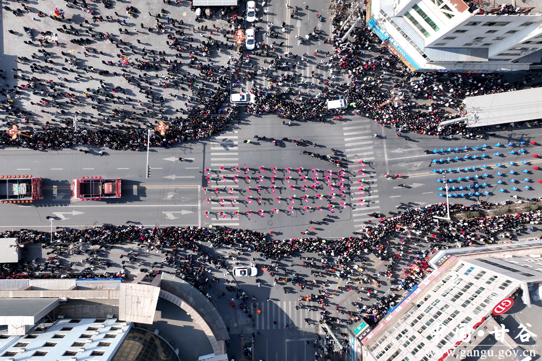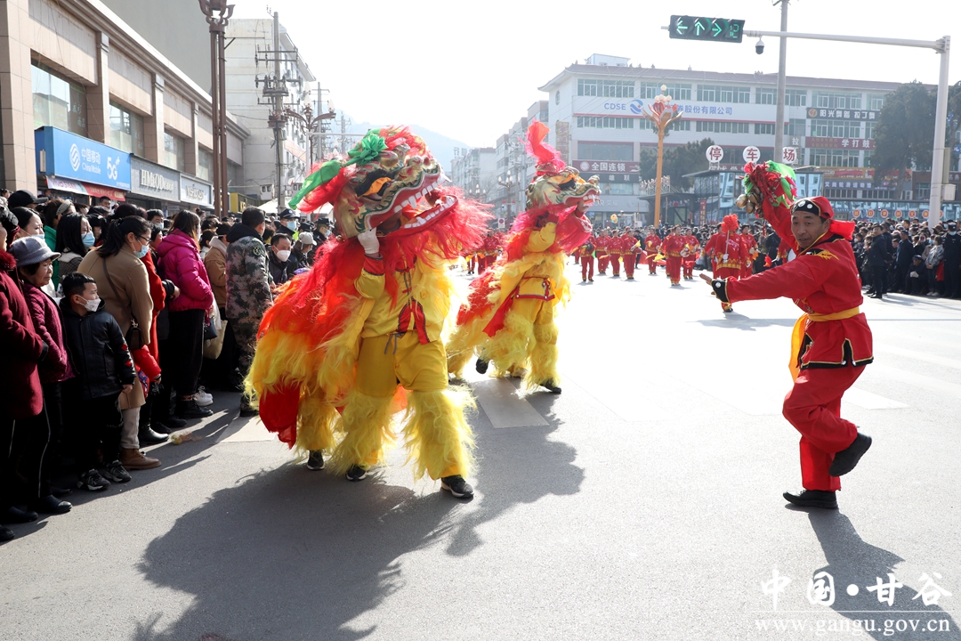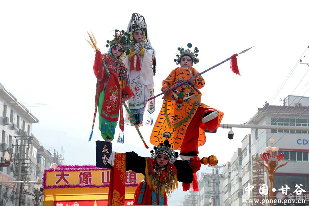 演员们个个喜笑颜开,身着华丽的服饰,精神抖擞、神采飞扬,随着喜庆的歌声舞动着身躯,排踩着欢快的鼓点相继亮相。大气磅礴的太平鼓、辗转腾挪的舞狮、独具特色的旱船、风趣诙谐的舞蹈、花团锦簇的彩车轮番上演,闹红了甘谷的正月天,也闹出了一个多姿多彩、有声有色的新春佳节。