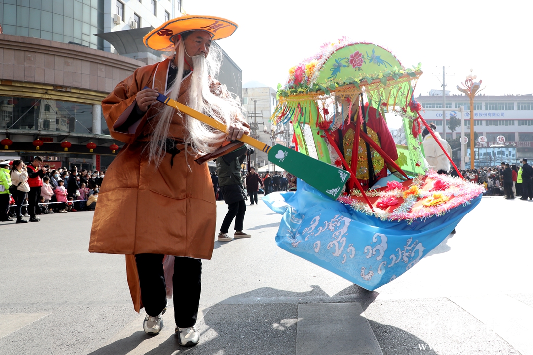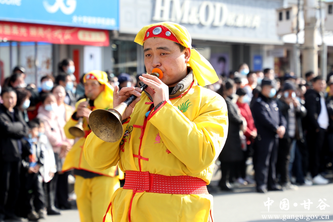 下午一时许,伴随着欢快喜庆的旋律,由乡镇、单位、企业组织的秧歌队从南关十字开始,自南向北沿新城路行进式表演了100多个丰富多彩的社火节目。