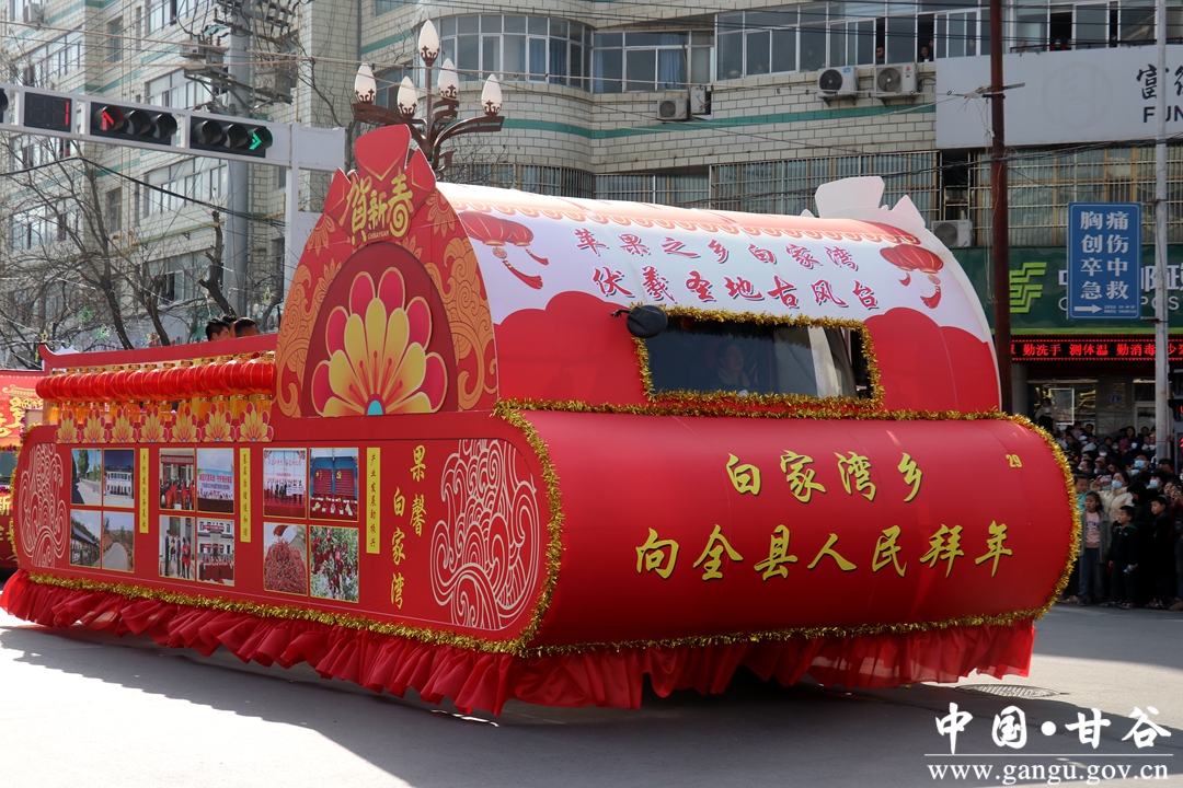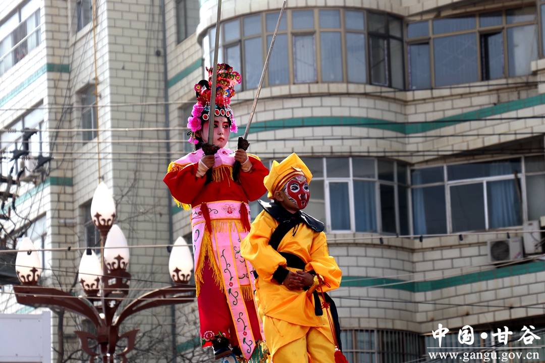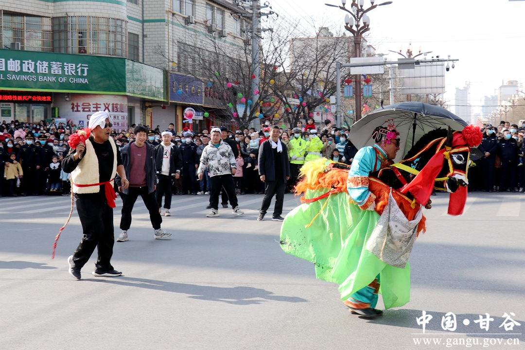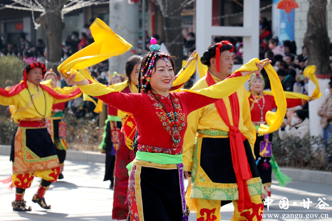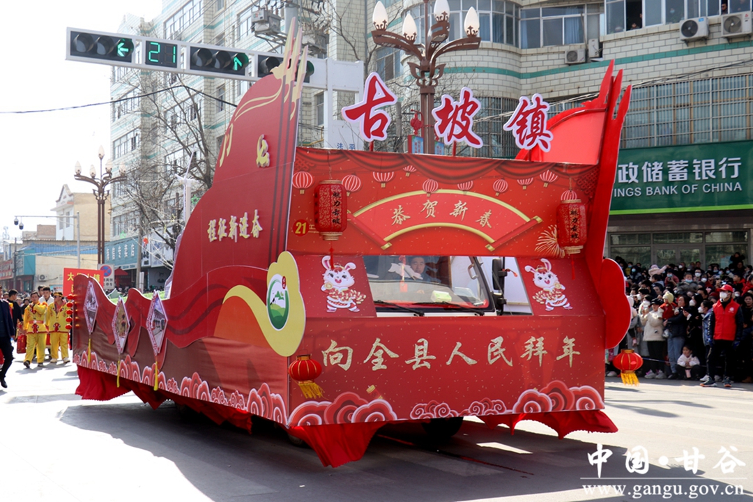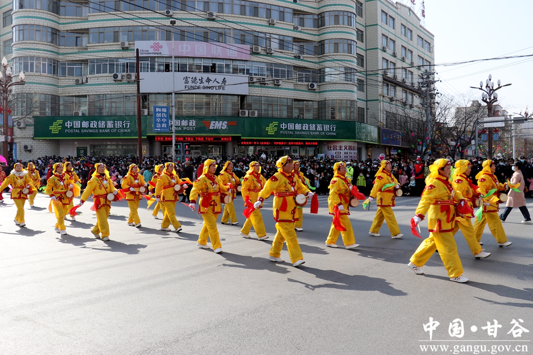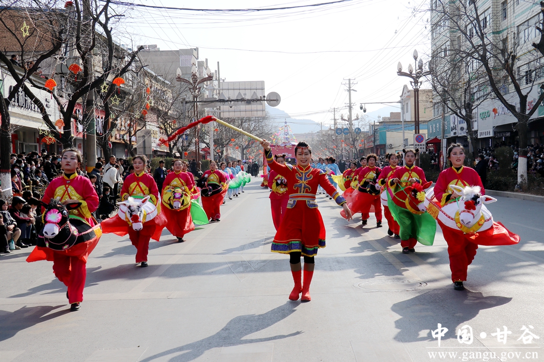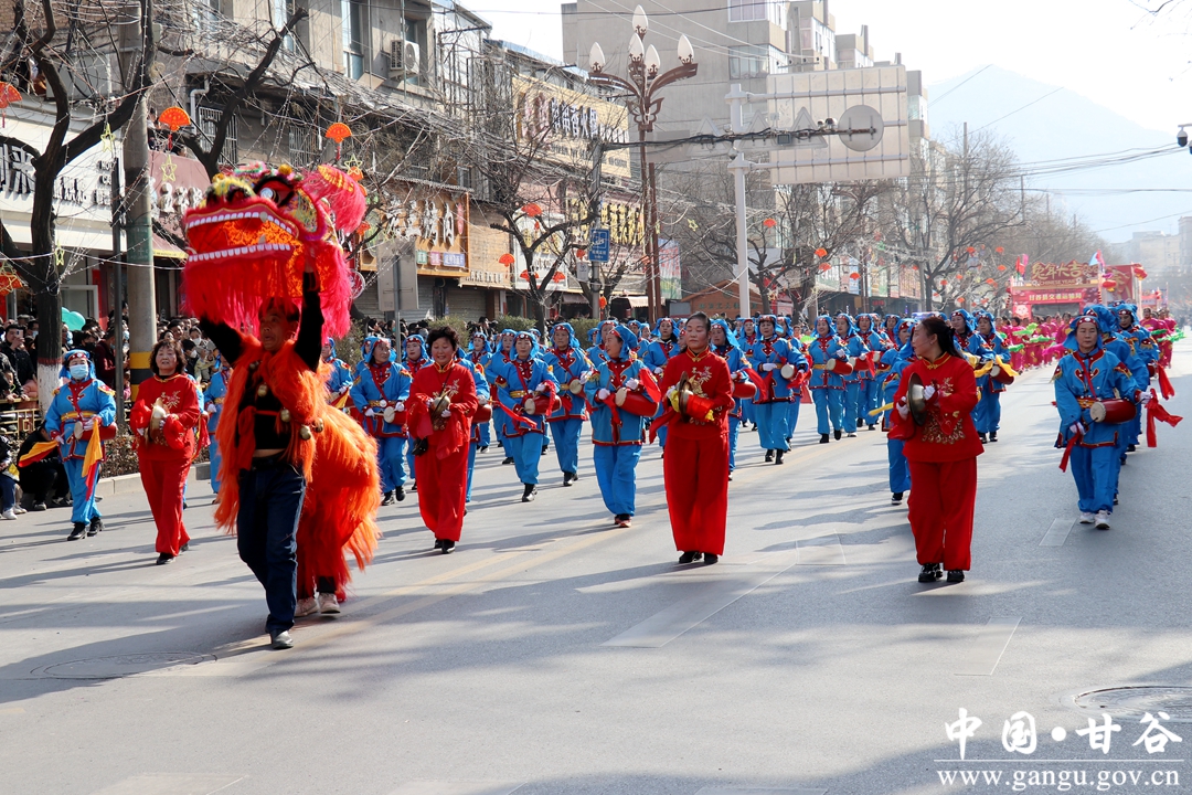 演员们个个喜笑颜开,身着华丽的服饰,精神抖擞、神采飞扬,随着喜庆的歌声舞动着身躯,排踩着欢快的鼓点相继亮相。大气磅礴的太平鼓、辗转腾挪的舞狮、独具特色的旱船、风趣诙谐的舞蹈、花团锦簇的彩车轮番上演,闹红了甘谷的正月天,也闹出了一个多姿多彩、有声有色的新春佳节。