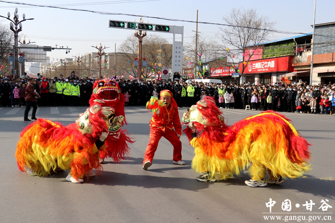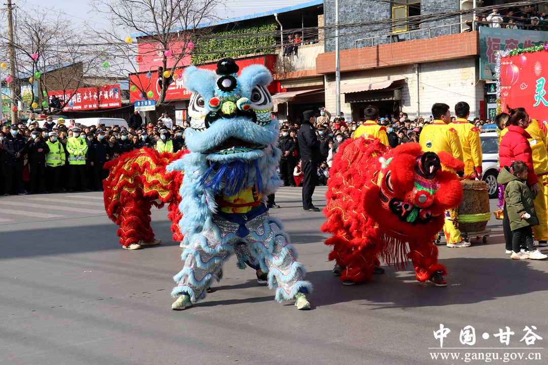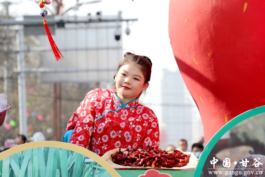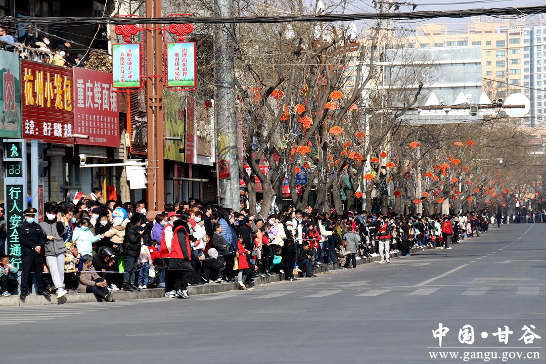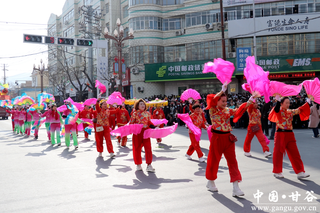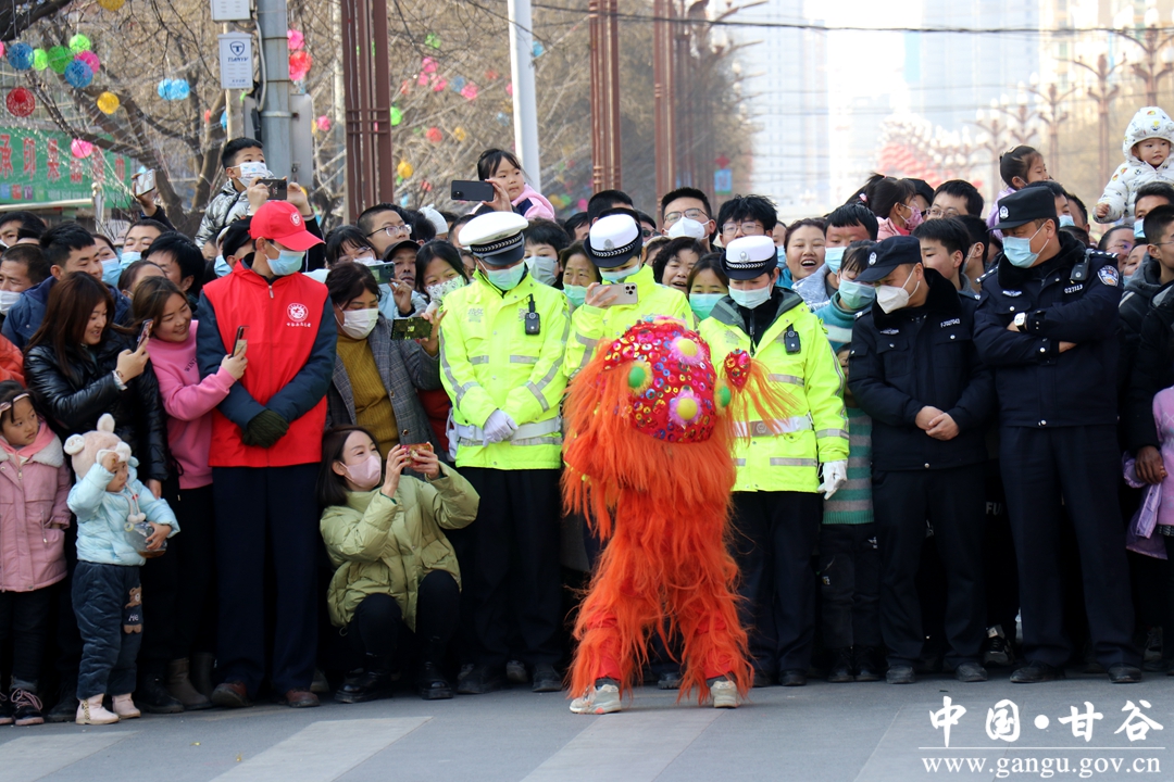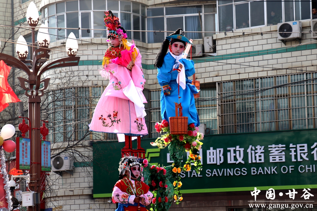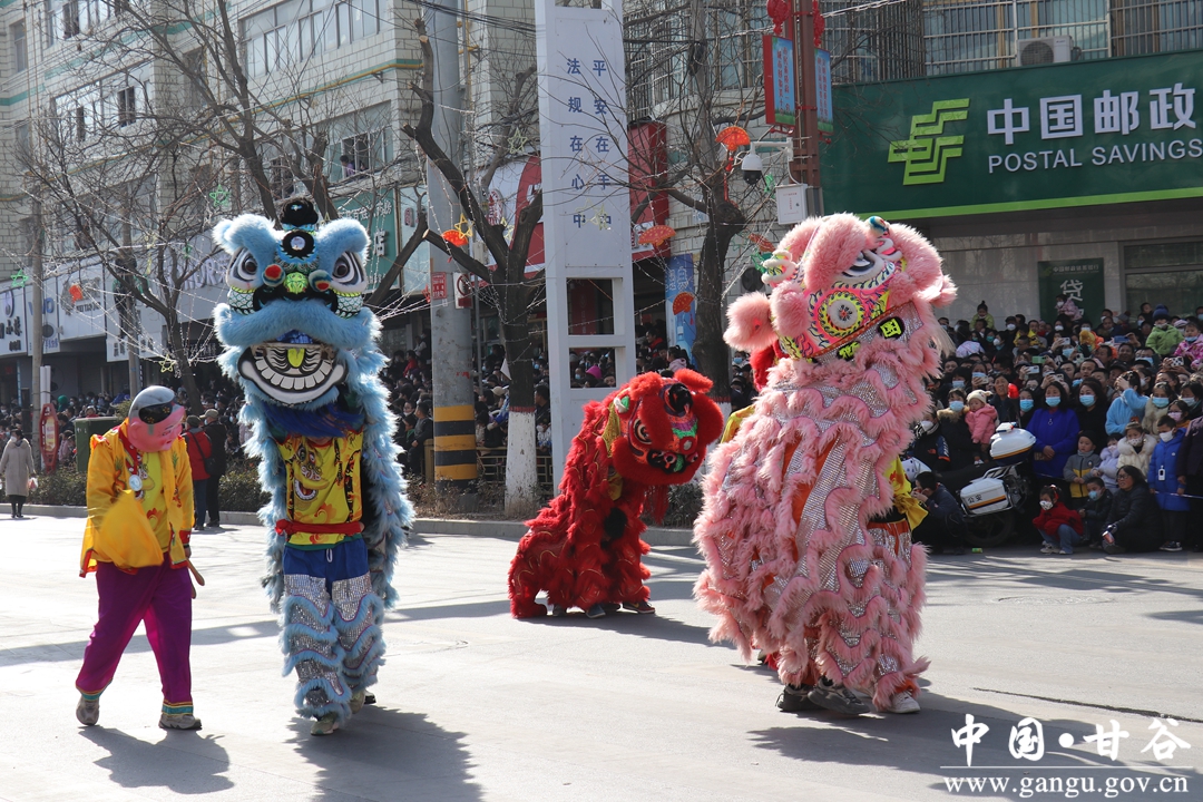 演员们个个喜笑颜开,身着华丽的服饰,精神抖擞、神采飞扬,随着喜庆的歌声舞动着身躯,排踩着欢快的鼓点相继亮相。大气磅礴的太平鼓、辗转腾挪的舞狮、独具特色的旱船、风趣诙谐的舞蹈、花团锦簇的彩车轮番上演,闹红了甘谷的正月天,也闹出了一个多姿多彩、有声有色的新春佳节。